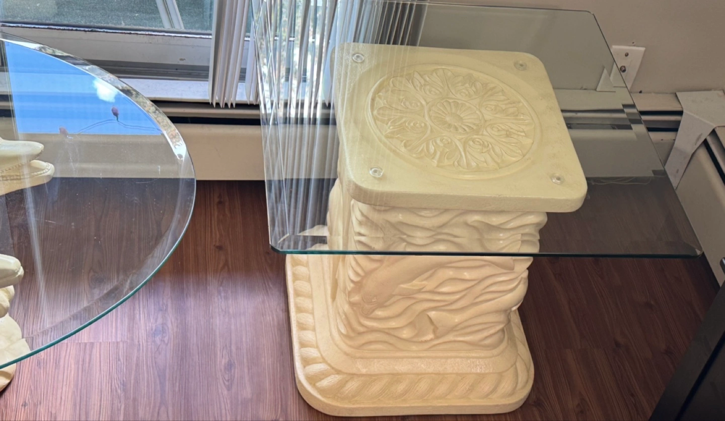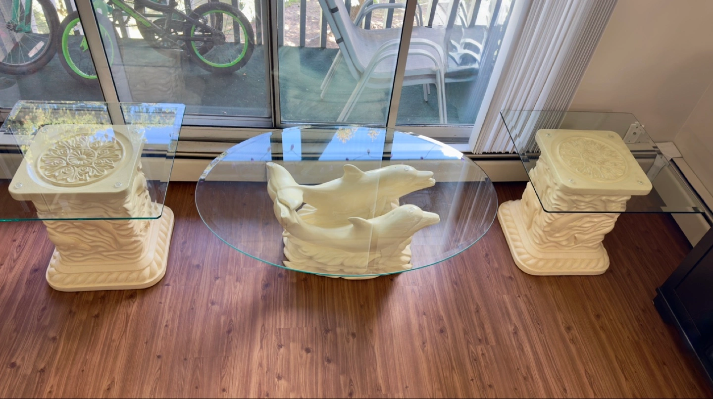 Add a touch of oceanic charm to your living space with this unique vintage dolphin coffee table and matching side tables! This used glass-top table features a delightful dolphin sculpture base, perfect for any sea-loving home. The side tables complement the set with their matching base. Please note that these items are used. * Coffee Table Dimensions: 48"x30" * Side Tables Dimensions: 24"x24" Only available for pick up.