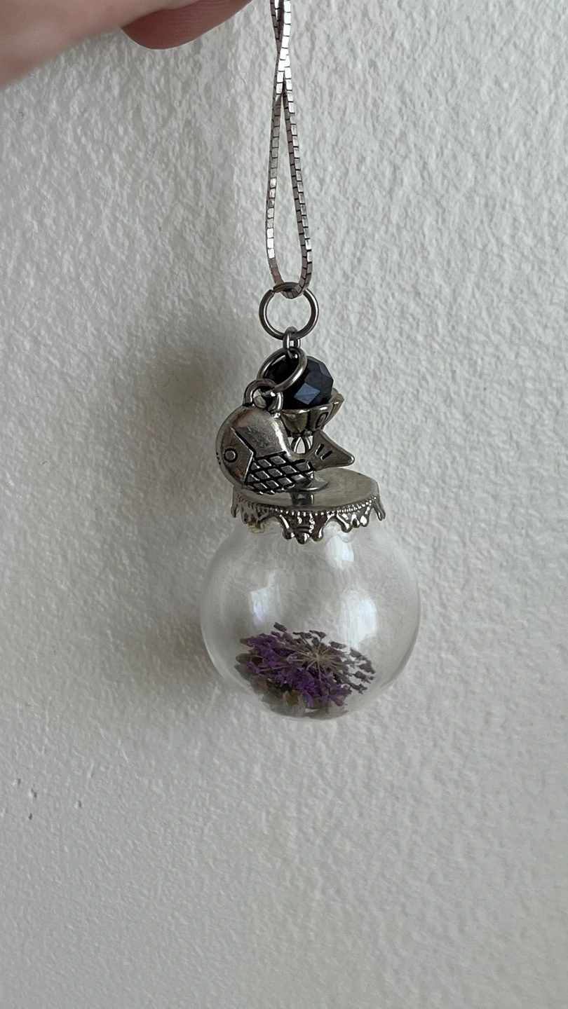 Silver tone pendant. Features a small glass globe filled with dried purple flowers. A small silver bird charm and a dark purple gemstone accent the pendant.