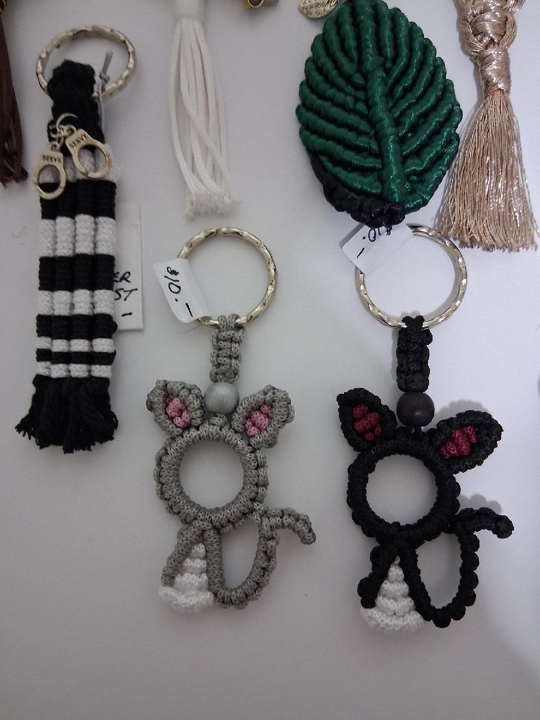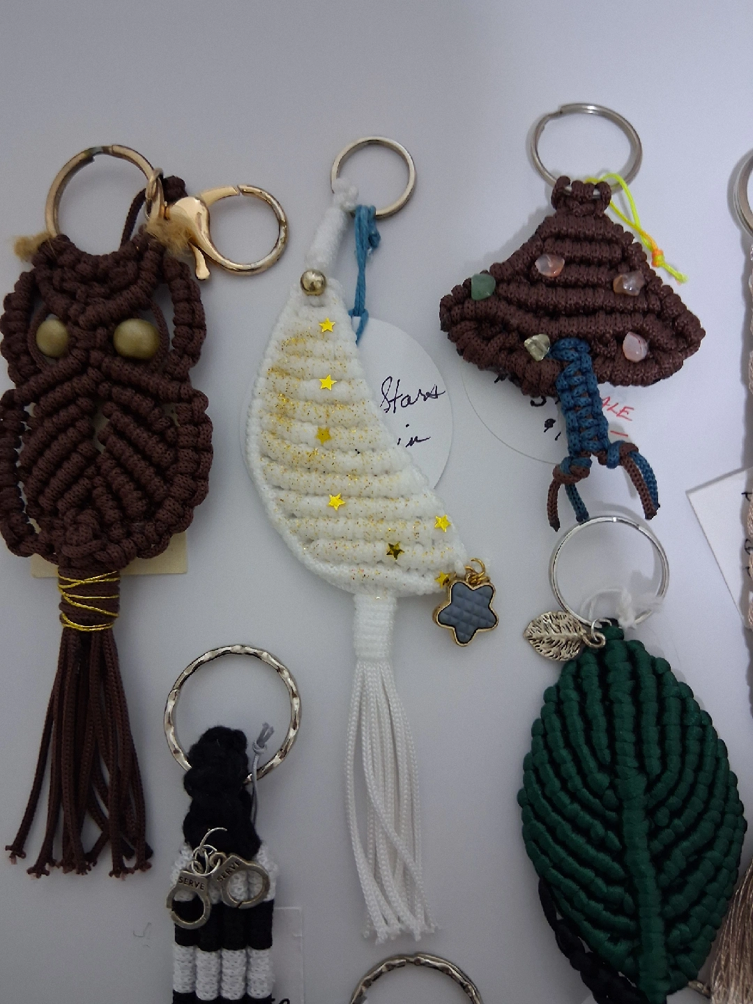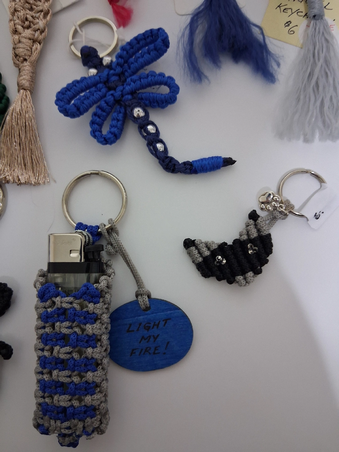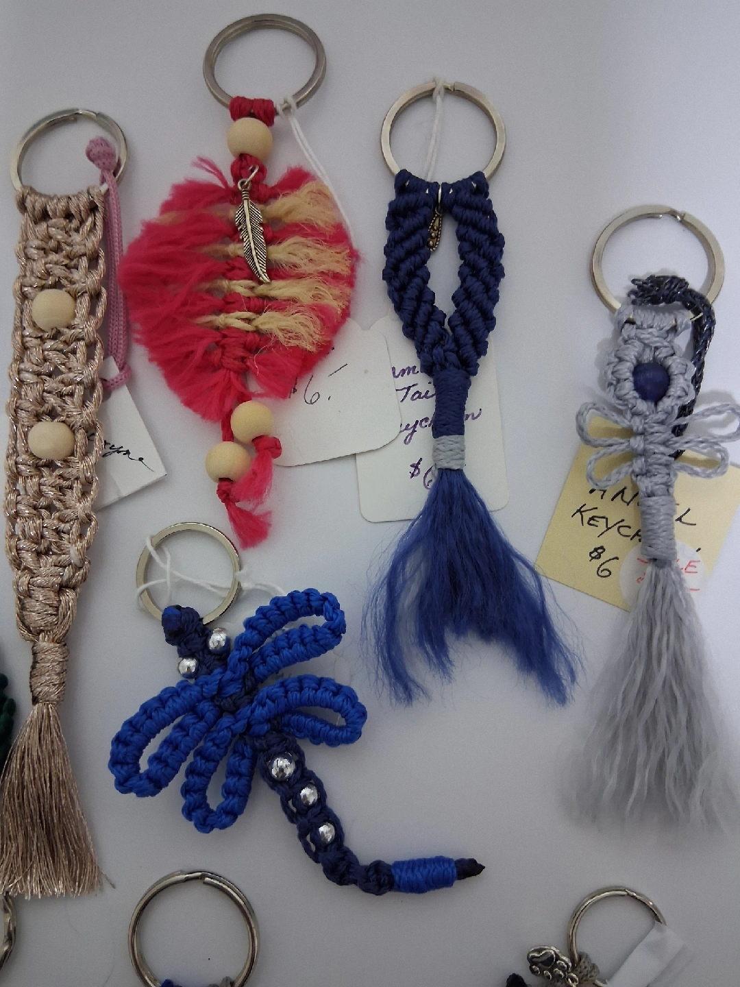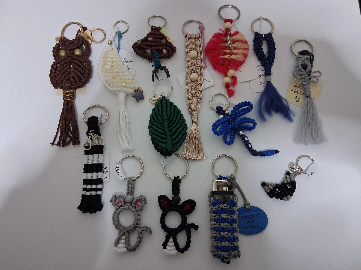 53Unique handmade macrame keychains. Owl, moon, dragonfly, mushroom, mermaid tail, angel, lucky leaf, heart, officer/guard, champaign, grey cat, black cat, cat face, lighter holder. Prices $6- $12. Please msg for price of your chosen one. Pick up near GM Oshawa.