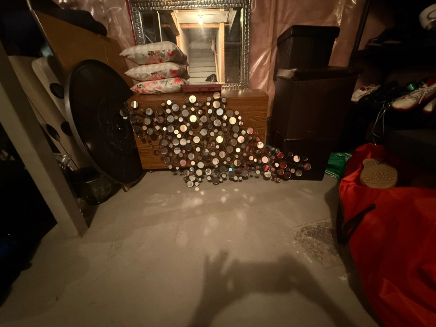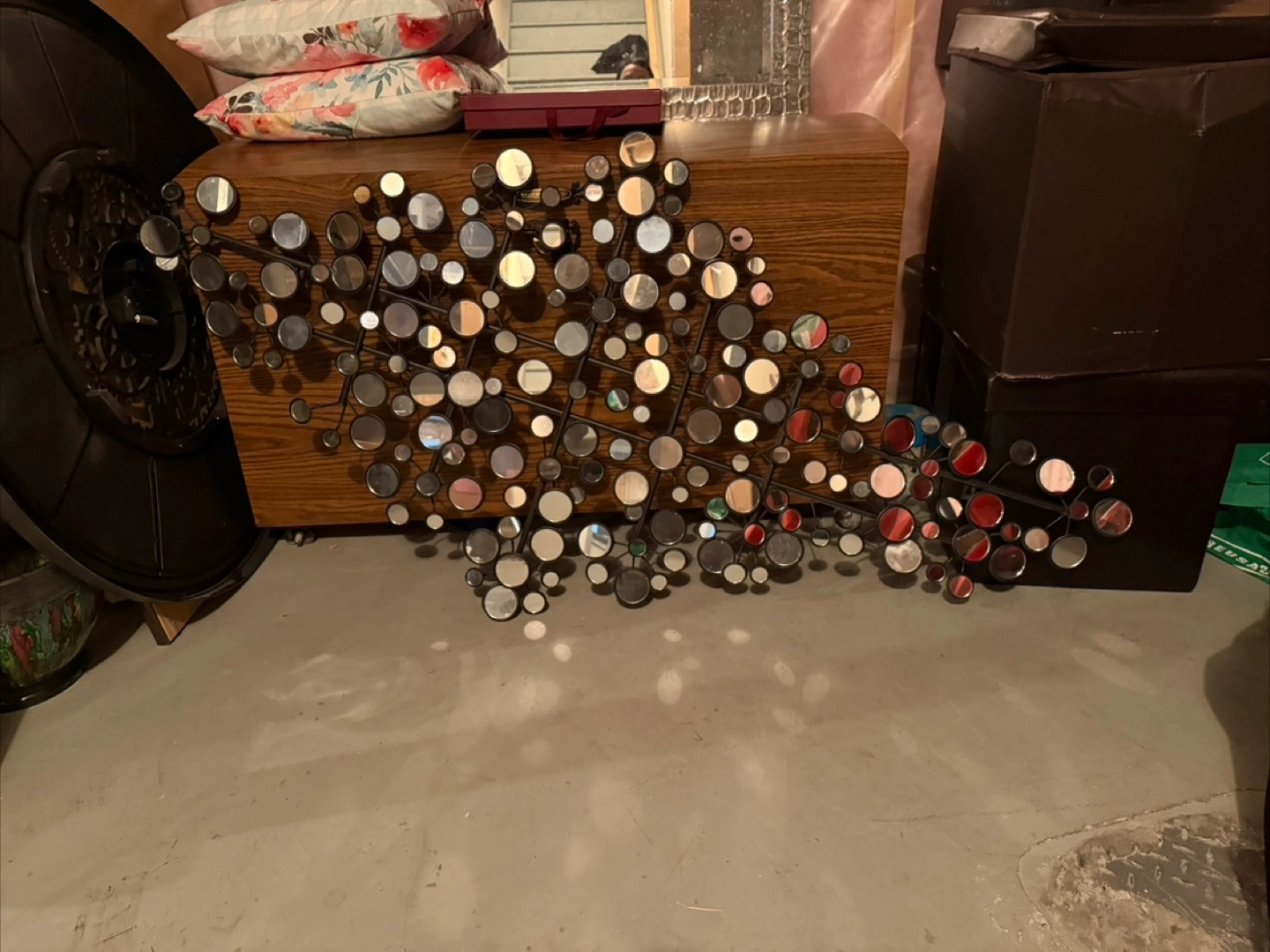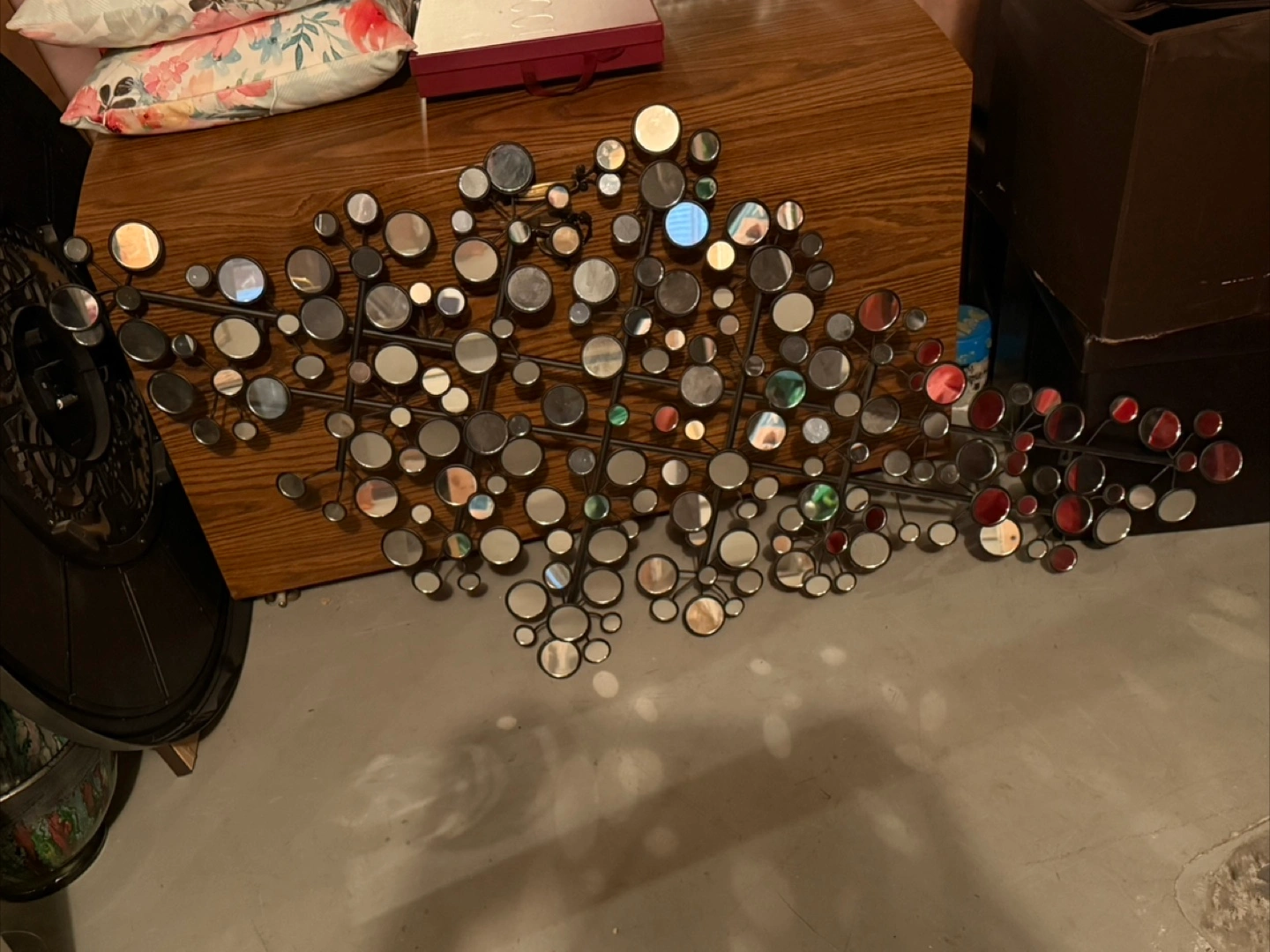 Large mirrored wall hanging. Many small circular mirrors attached to a dark metal framework. Modern design. Great statement piece.