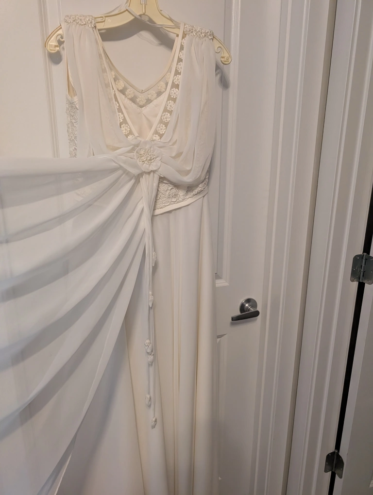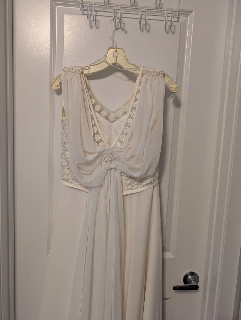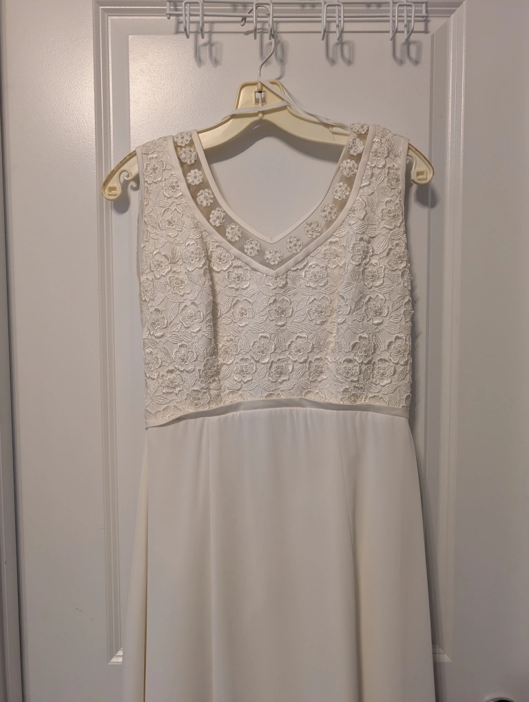 5Elegant A-line gown. Features a sleeveless design, delicate lace detailing, and sheer overlay. Floor-length. Perfect for a special occasion.