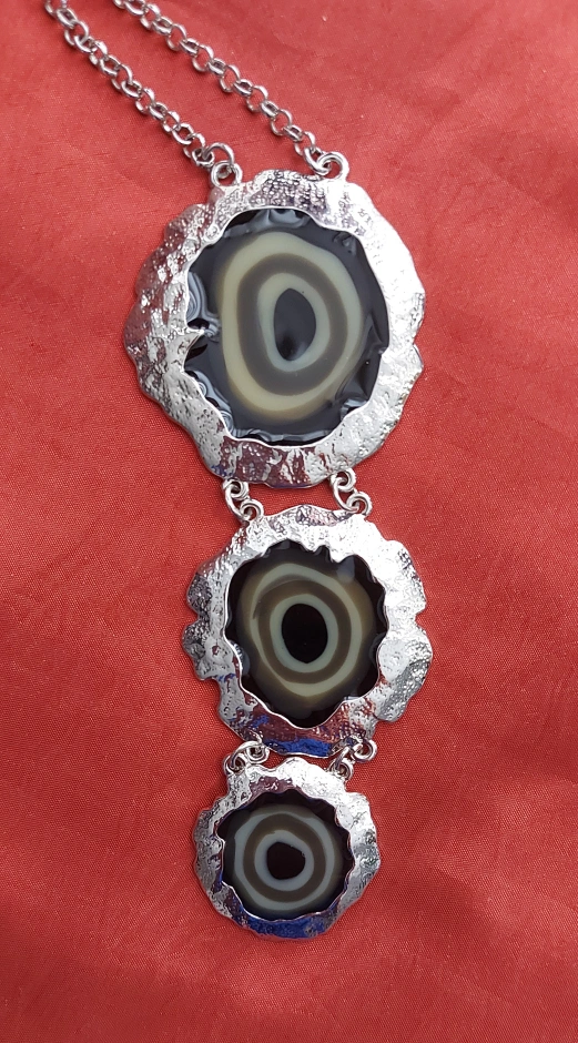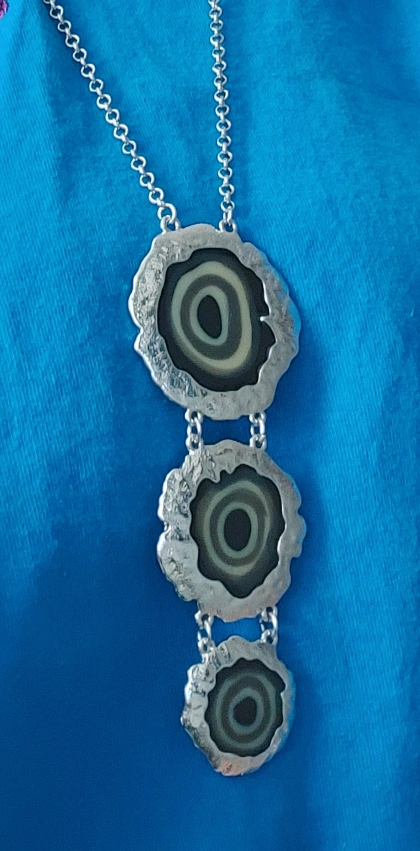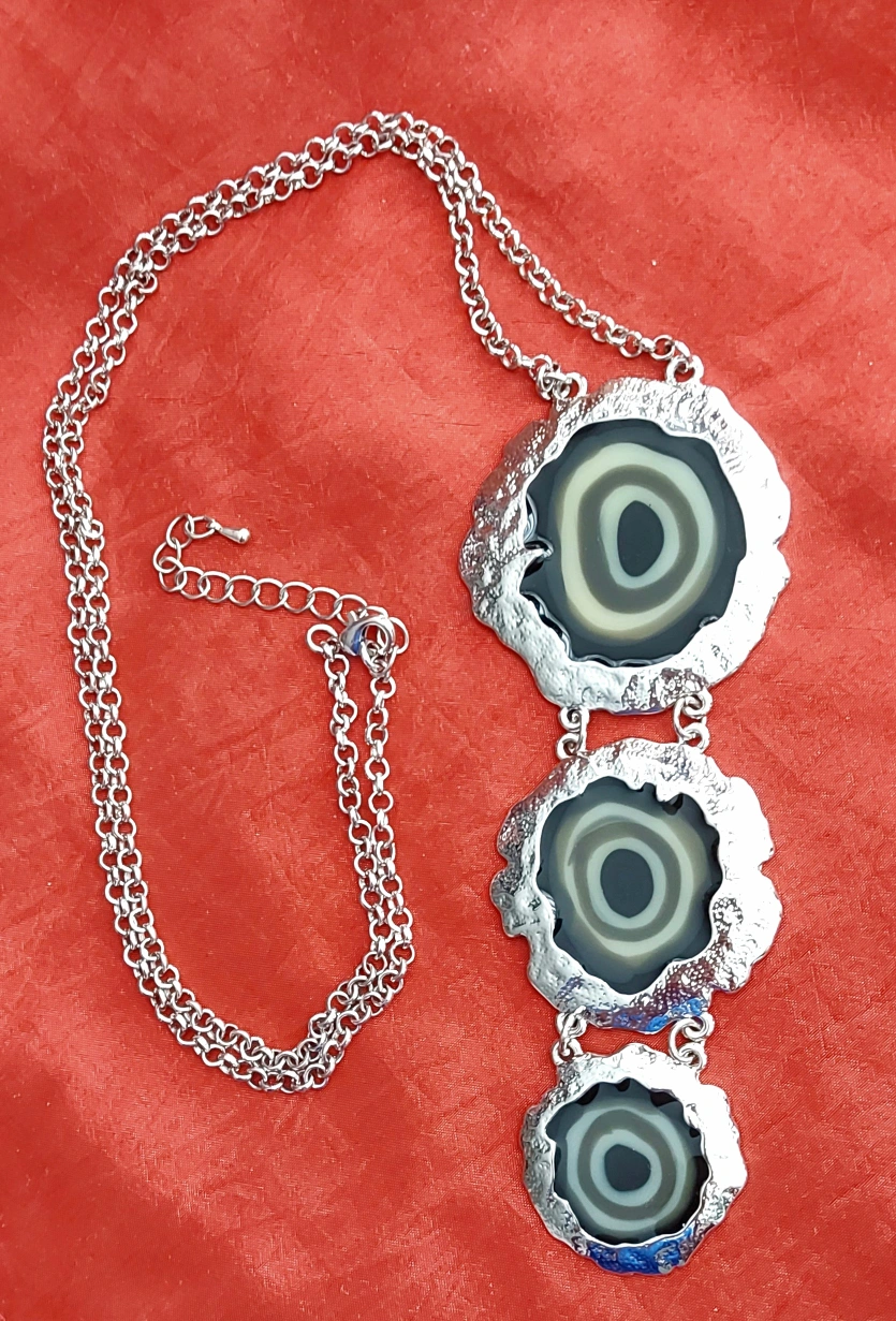 1000+Eye-catching statement necklace. Features three circular stones with a swirling pattern. Silver-toned metal chain and settings. Elegant and stylish. Each side 18". Pick up only Pet free and smoke free household Yonge and Eglinton area Only cash payment