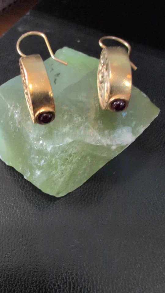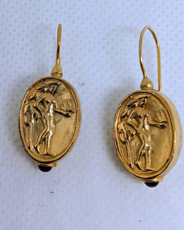 Gold plated Pewter Goddess Aphrodite earrings with Garnet accent at bottom.