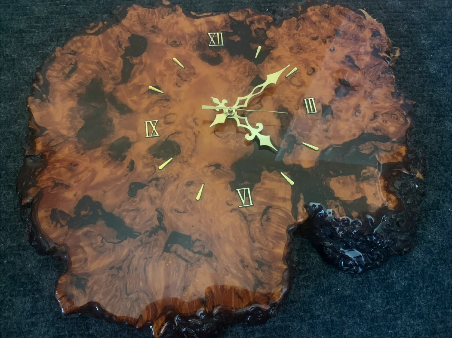 30Check out this unique wall clock! It's made from a beautiful slice of wood, giving it a natural and rustic look. The clock features Roman numerals and gold-tone hands. It would make a great addition to any home decor
