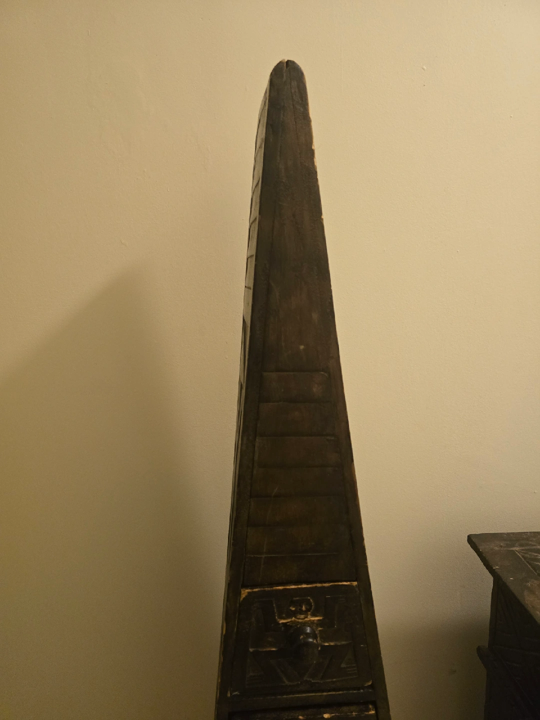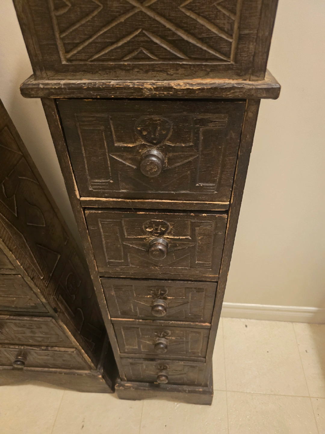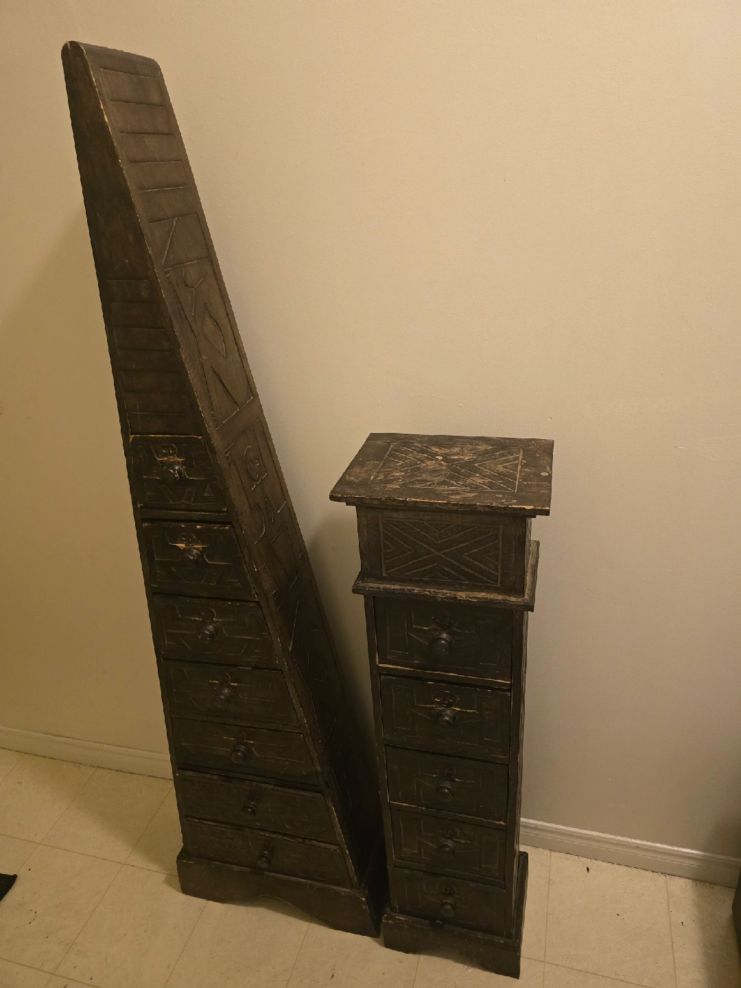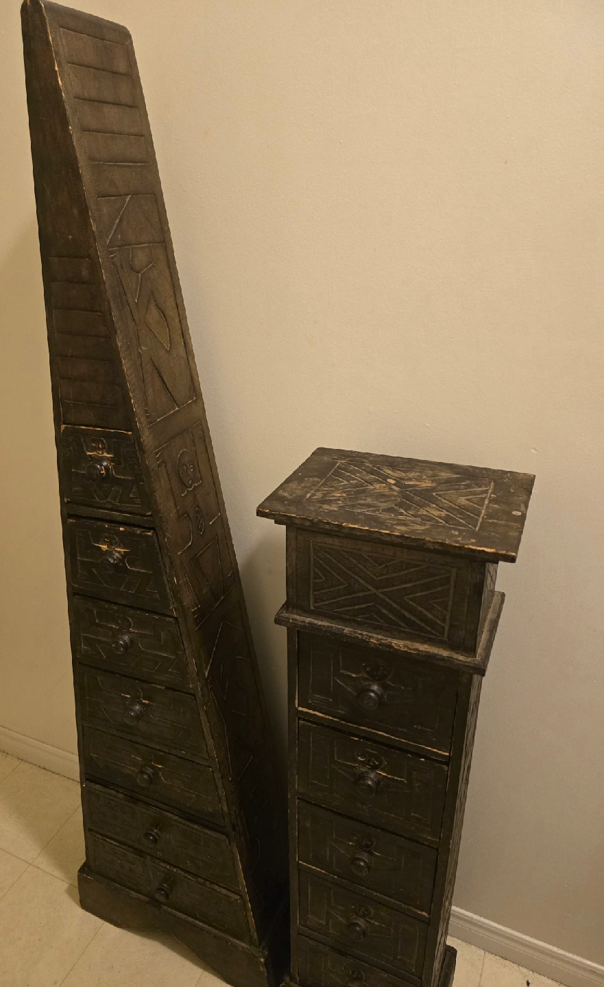 10Selling a unique set of wooden chests! One is an obelisk shape and the other is a pedestal shape. Both have multiple drawers and interesting carved designs. Perfect for adding a touch of character to any room!