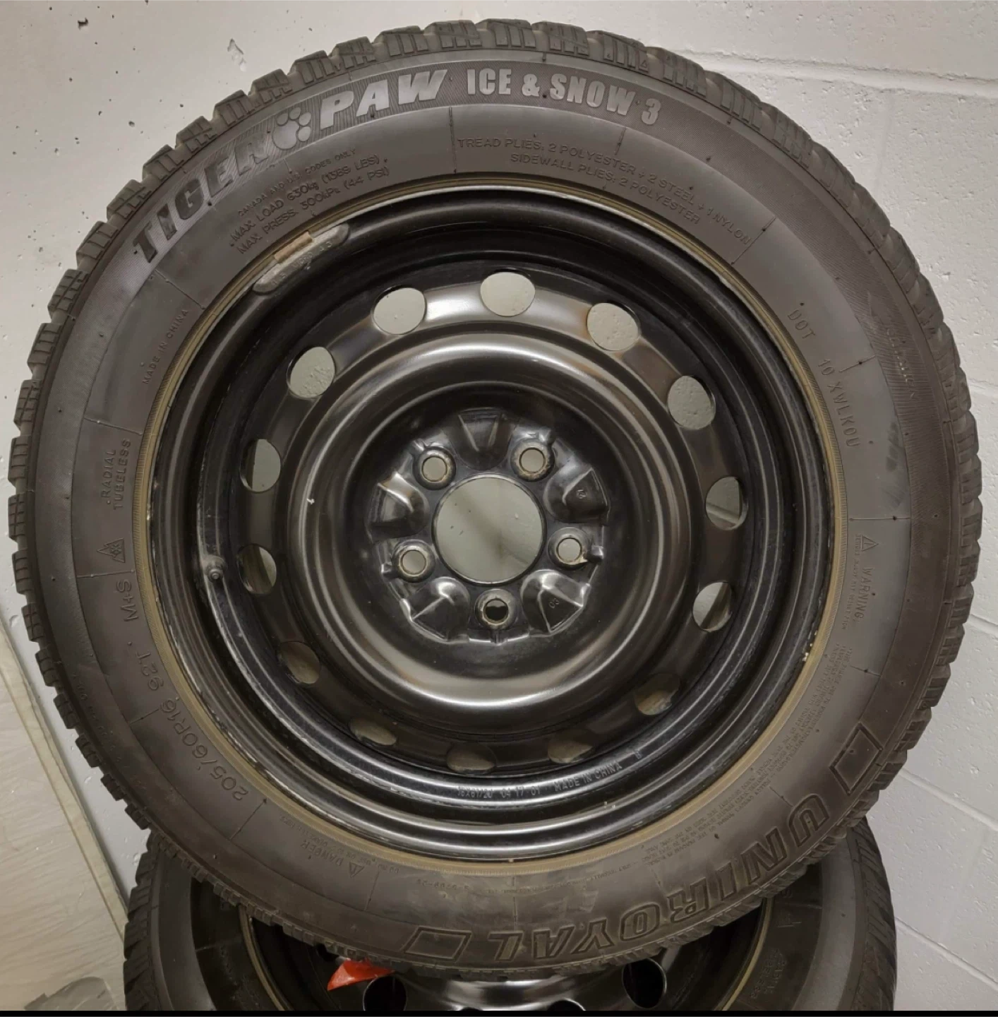205/60R16 Uniroyal Tiger Paw Ice & Snow 3 Winter Tires on Steel Rims – 5×114.3 bolt pattern Set of 4 winter tires in good condition. Used for 3 winters, plenty of tread left. Mounted on 16-inch steel rims, bolt pattern 5×114.3 – fits many sedans like Mazda 3, Honda Civic, Toyota Corolla, Hyundai Elantra, Kia Forte, etc. Balanced and ready to bolt on for the season. $400 Pickup in Coquitlam / Burnaby area