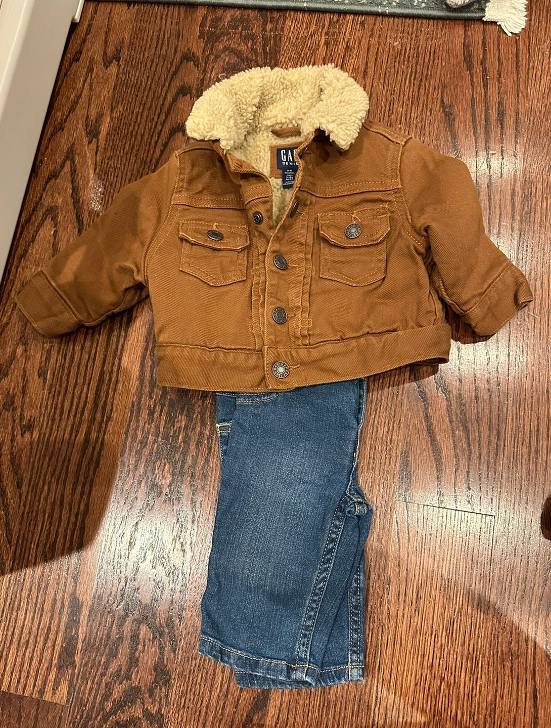 Brown denim jacket with a sherpa lining and blue denim jeans. Fits 3-6 months Maybe used 2 times as our boy grew fast. Very cute set for fall.