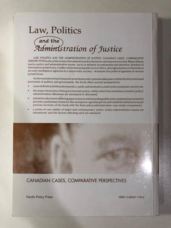 10Political Science Law, Politics and the Administration of Justice Canadian Cases, Comparative Perspectives (Paperback) Patrick J. Smith (Author) ISBN: [hidden information] Criminology/Policing You In Blue (Paperback) Saville & Cleveland (Author) ISBN 978-0-578-16420-5