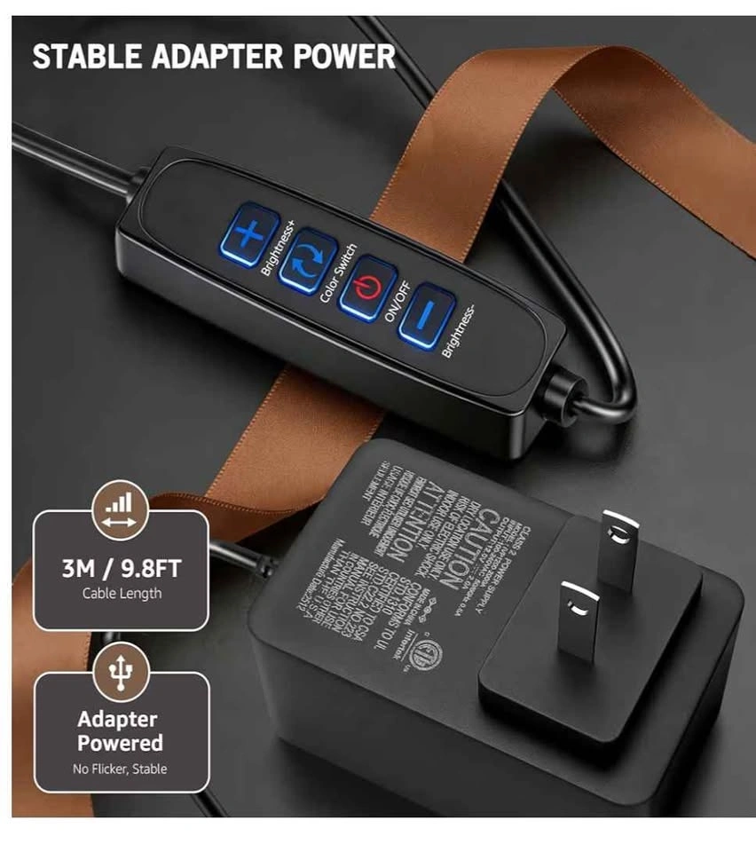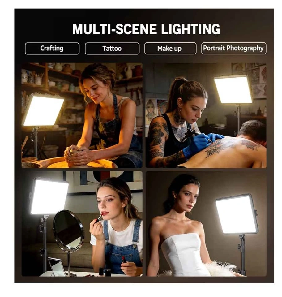 Versatile set of two NiceVeedi 25W LED light panels. Each light is 10 inches by 8 inches. They have dimmable brightness and adjustable color temperature. Comes with two tripods, two AC adapters, and a storage bag. Cable length is 9.8 feet. Good for crafting, tattoo work, makeup, or portrait photography.