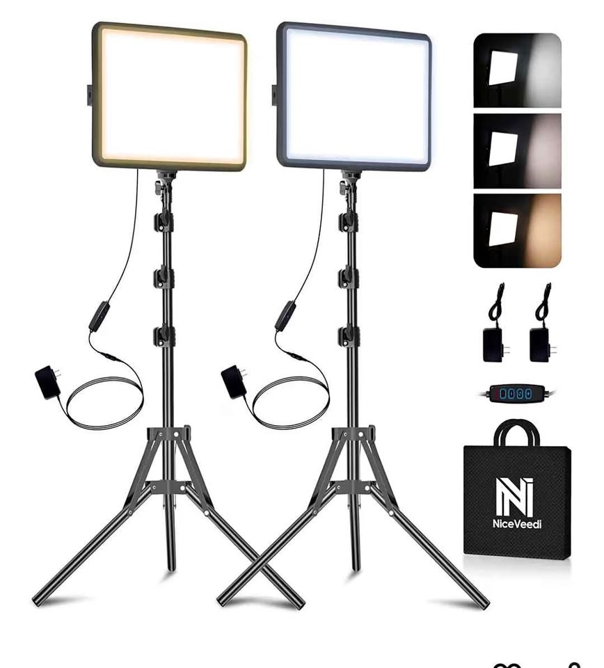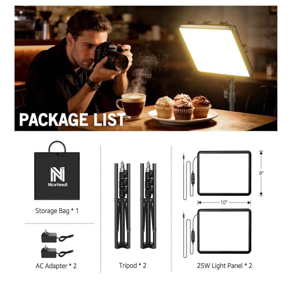 Versatile set of two NiceVeedi 25W LED light panels. Each light is 10 inches by 8 inches. They have dimmable brightness and adjustable color temperature. Comes with two tripods, two AC adapters, and a storage bag. Cable length is 9.8 feet. Good for crafting, tattoo work, makeup, or portrait photography.