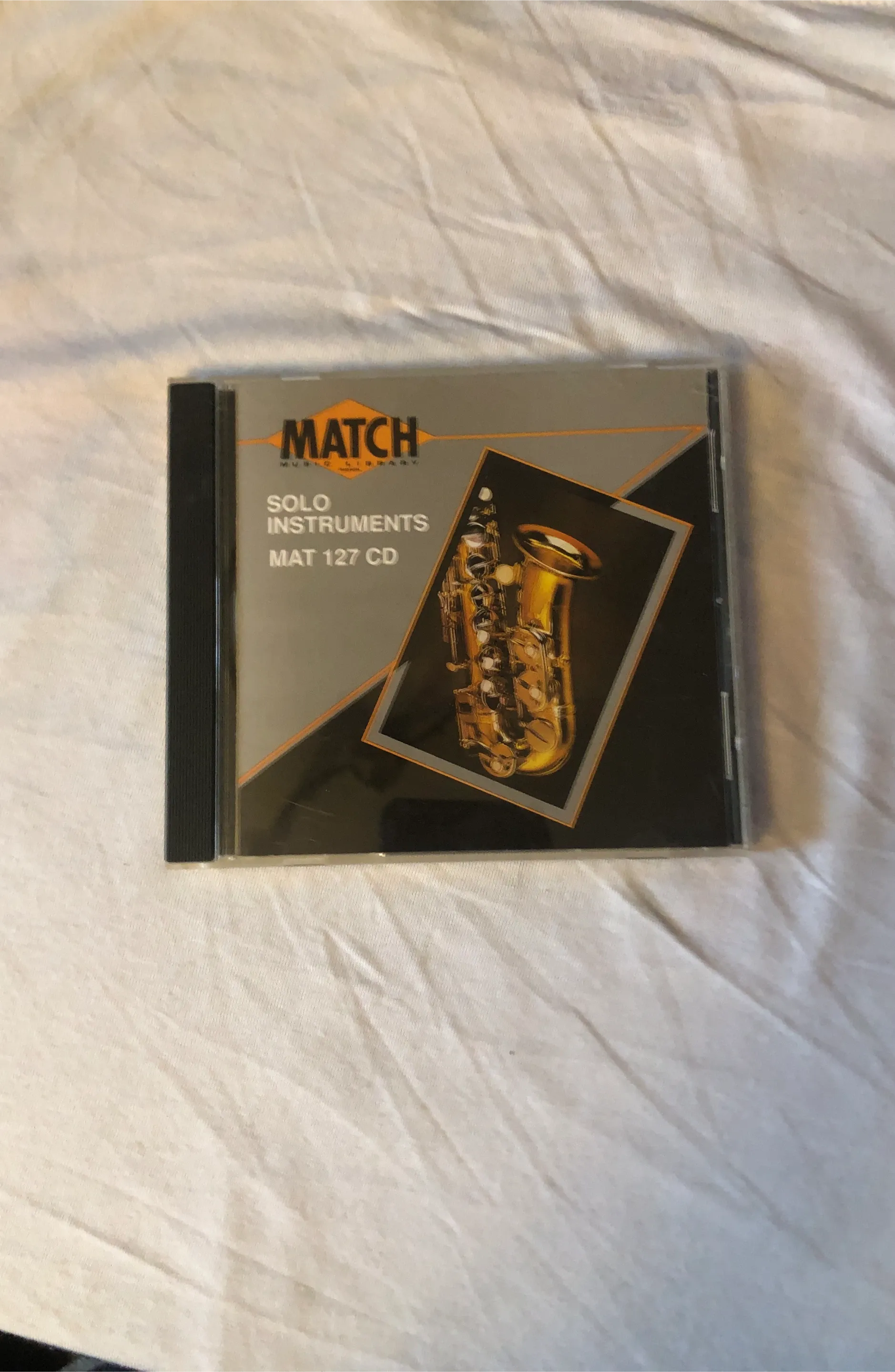 Selling a CD from the Match Music Library series, titled 'Solo Instruments' with the code MAT 127. It features a cool saxophone design on the cover! Perfect for musicians or music enthusiasts looking for unique instrumental tracks