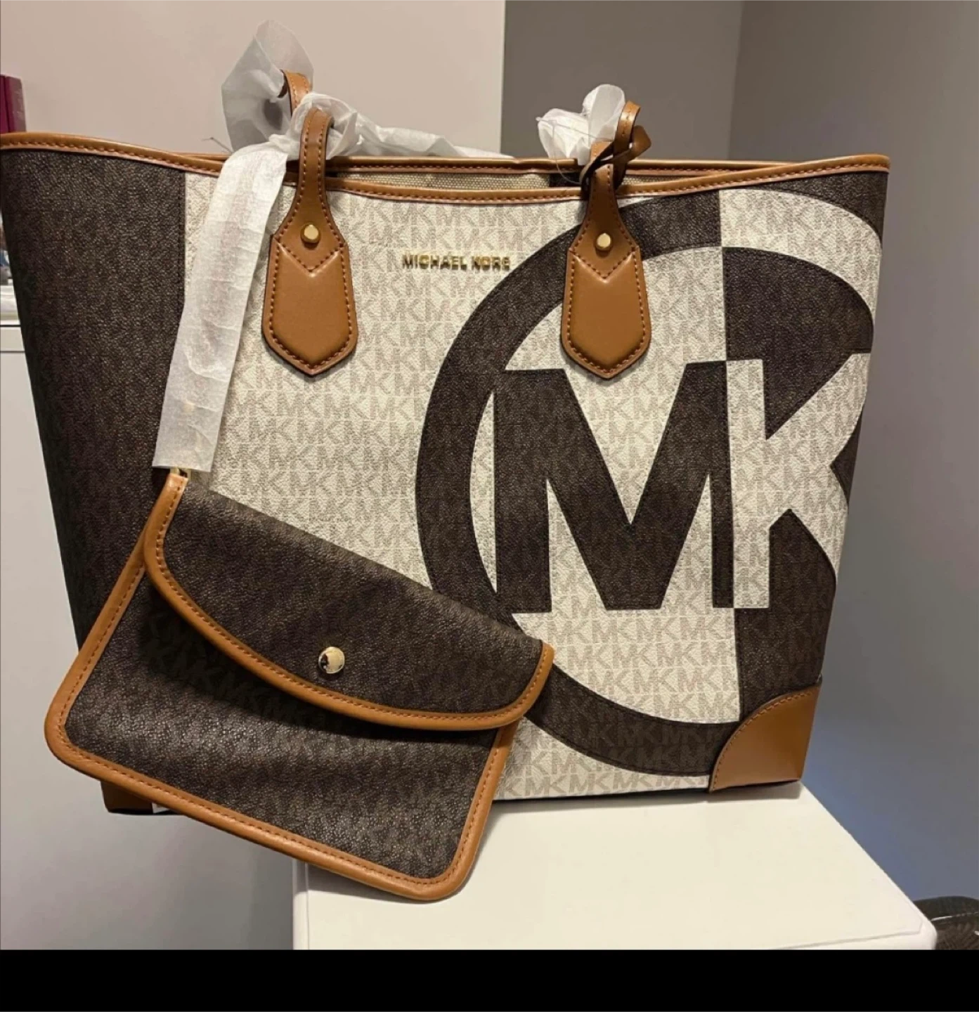 This is a Michael Kors tote bag in a signature MK print with brown leather trim and handles. It's a large size and includes a matching small pouch. Perfect for everyday use!