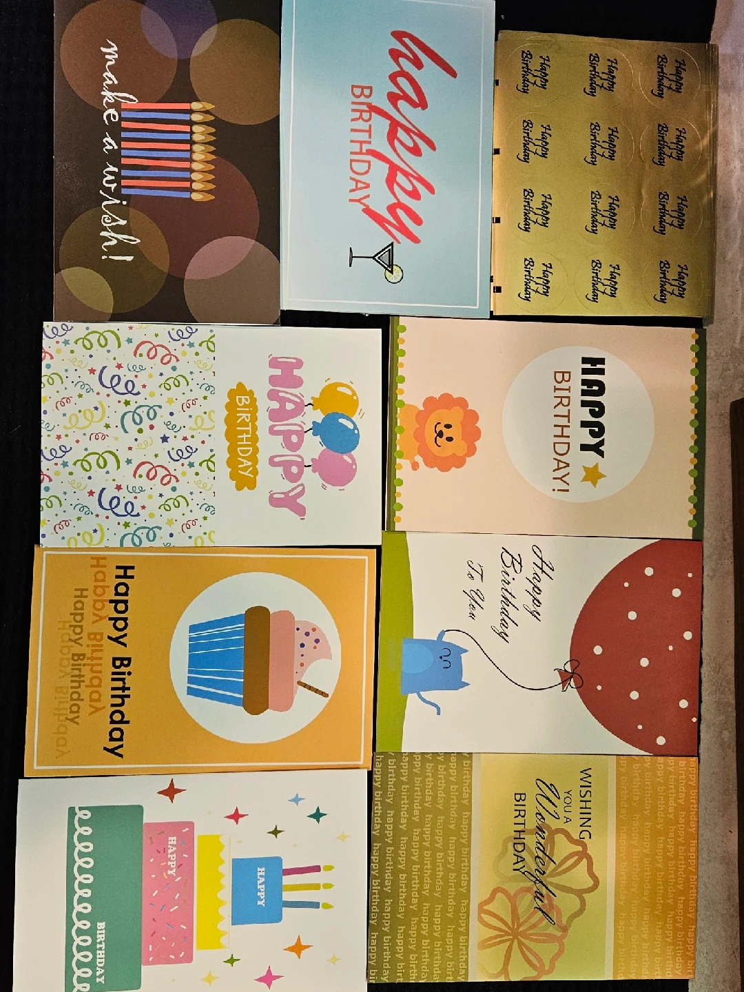 60Selling multiple boxes of assorted birthday cards. They feature 8 various designs, from cute animals to festive balloons and candles. Blank inside. Perfect for sending birthday wishes to classmates! Two boxes for $12.00