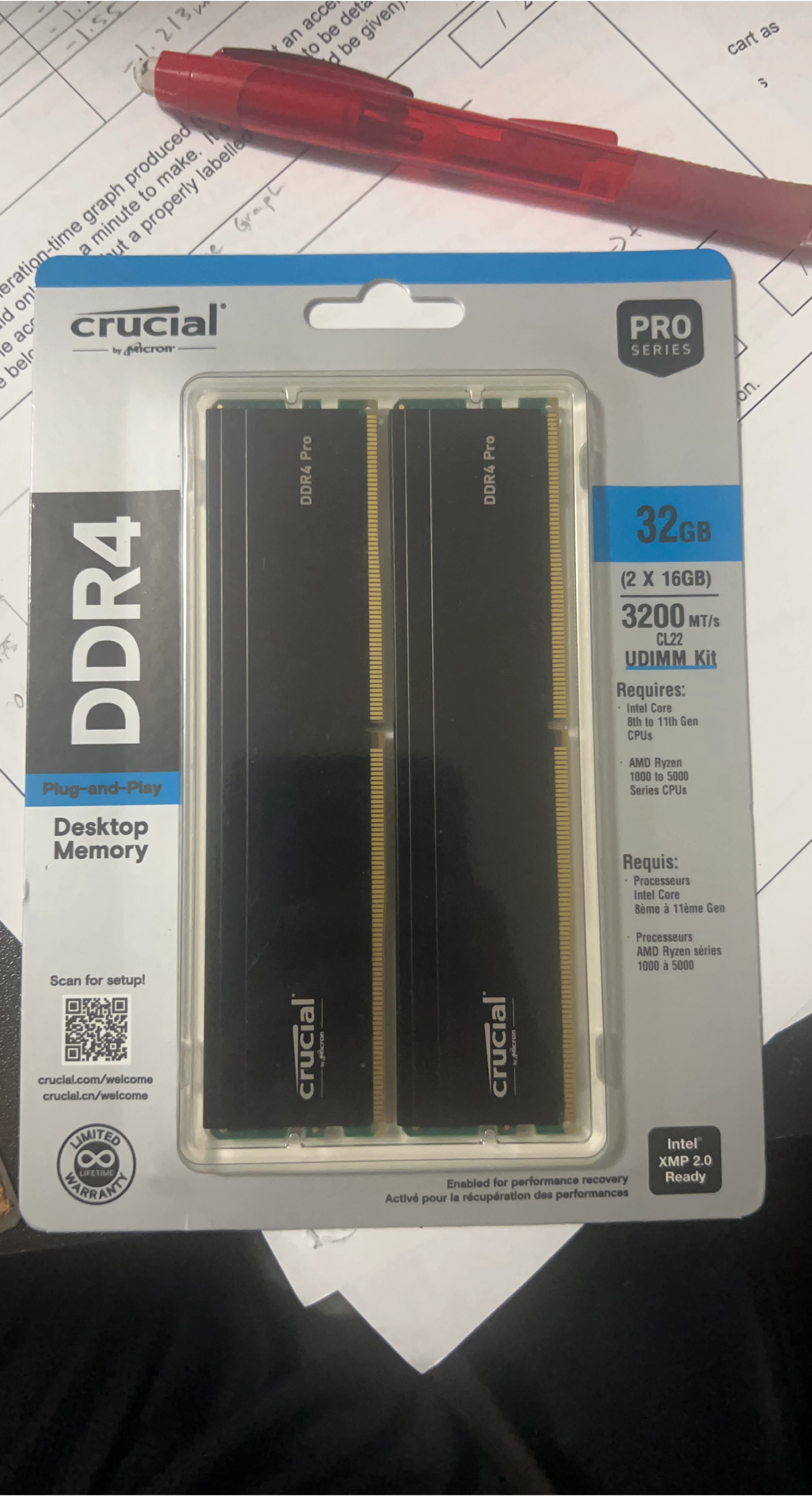 10Selling an unopened Crucial 32GB DDR4 desktop memory kit! This is the Pro Series, 3200 MT/s, CL22 UDIMM kit (2 x 16GB). It's for Intel Core 8th to 11th gen, and AMD Ryzen 1000 to 5000 series CPUs.