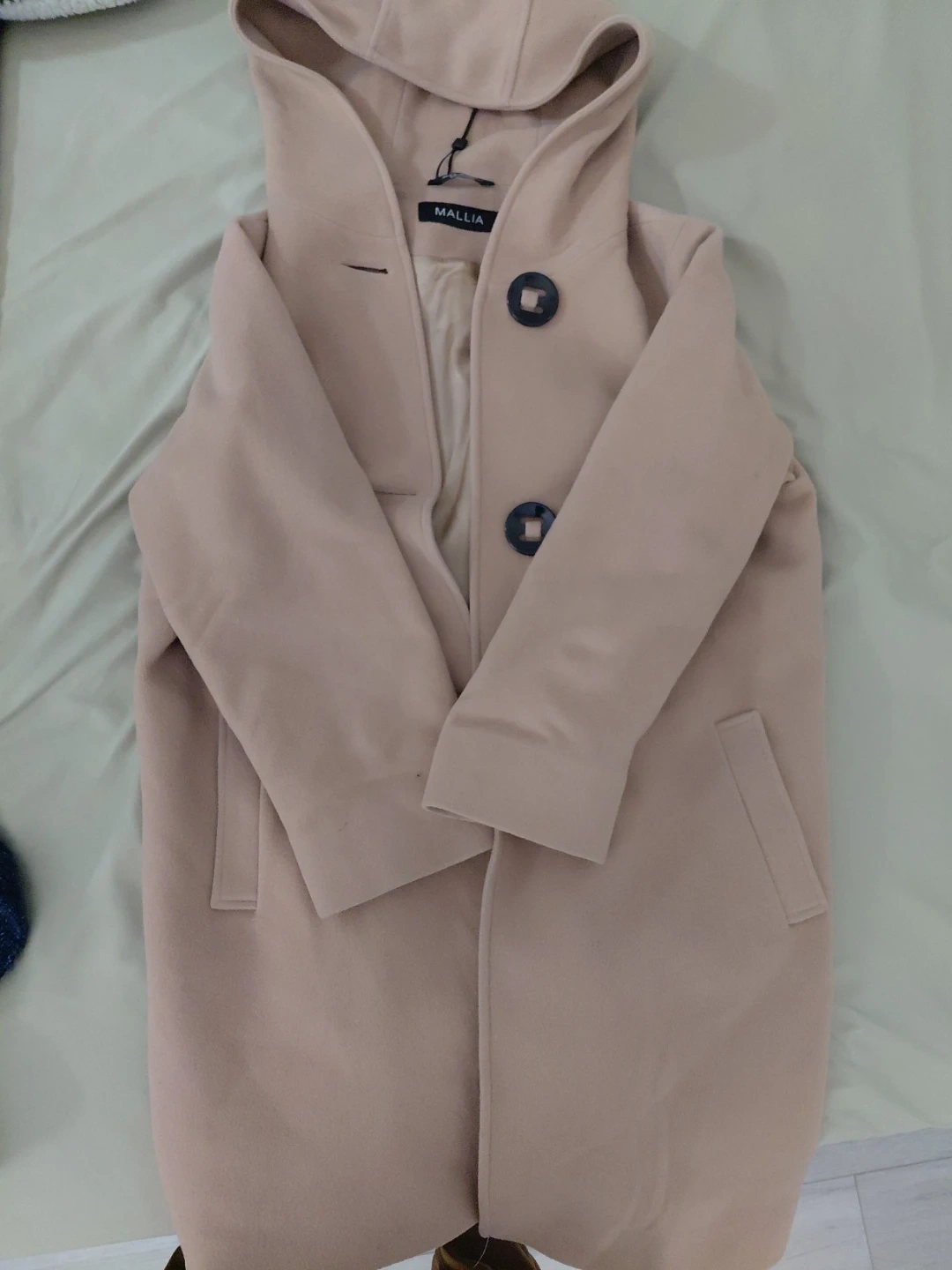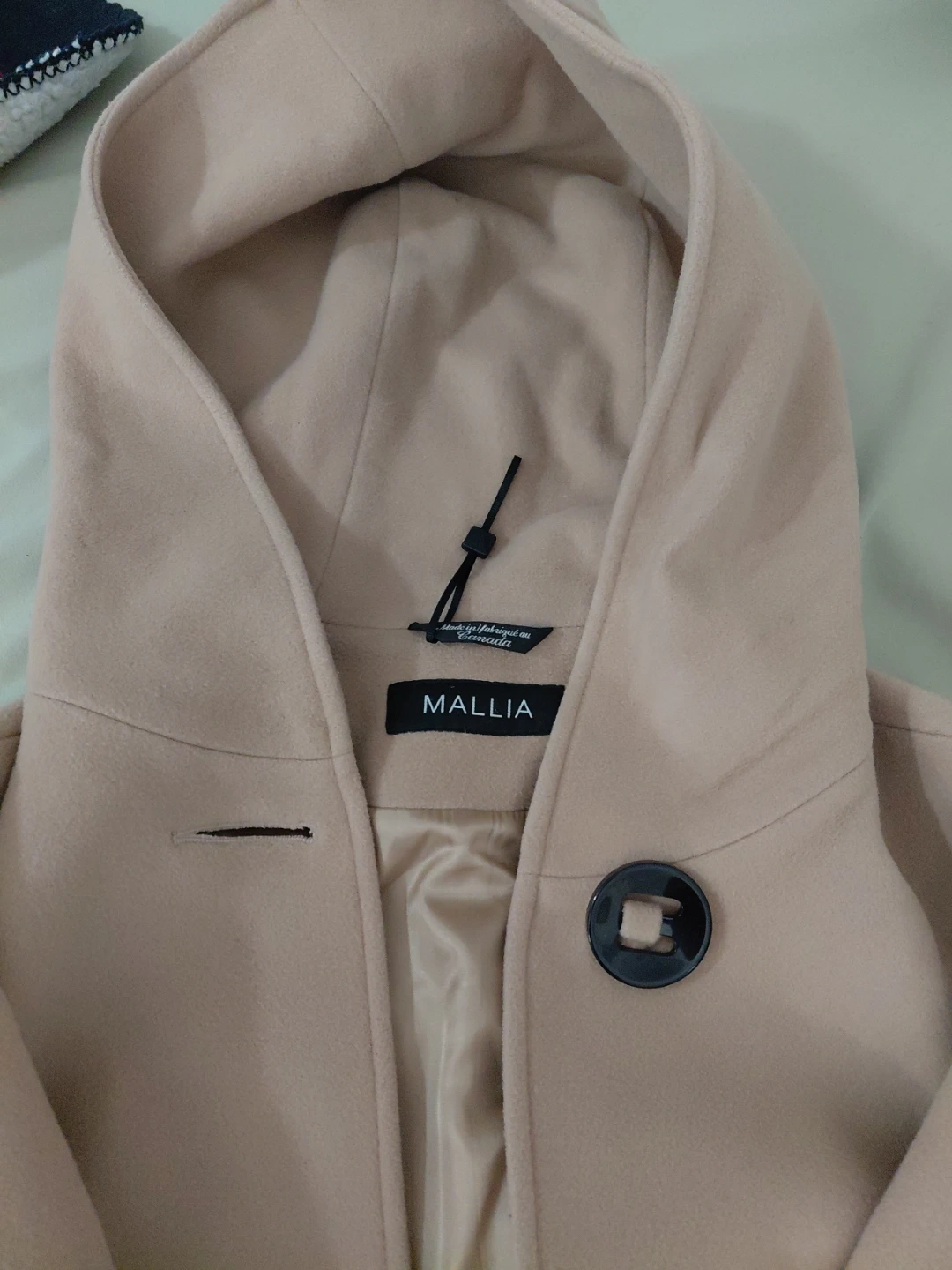 This stylish beige hooded coat is from Mallia. It features a unique button closure and a comfortable lining. A great outerwear piece for cooler weather!