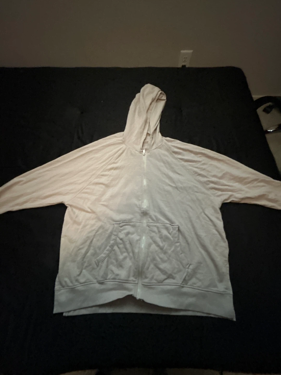 Cozy up with this beige zip-up hoodie from Unplug! It's a size large and perfect for layering. It features a comfortable hood and front pockets, great for keeping your hands warm on chilly days! It really needs a new home and someone that will give it attention!!