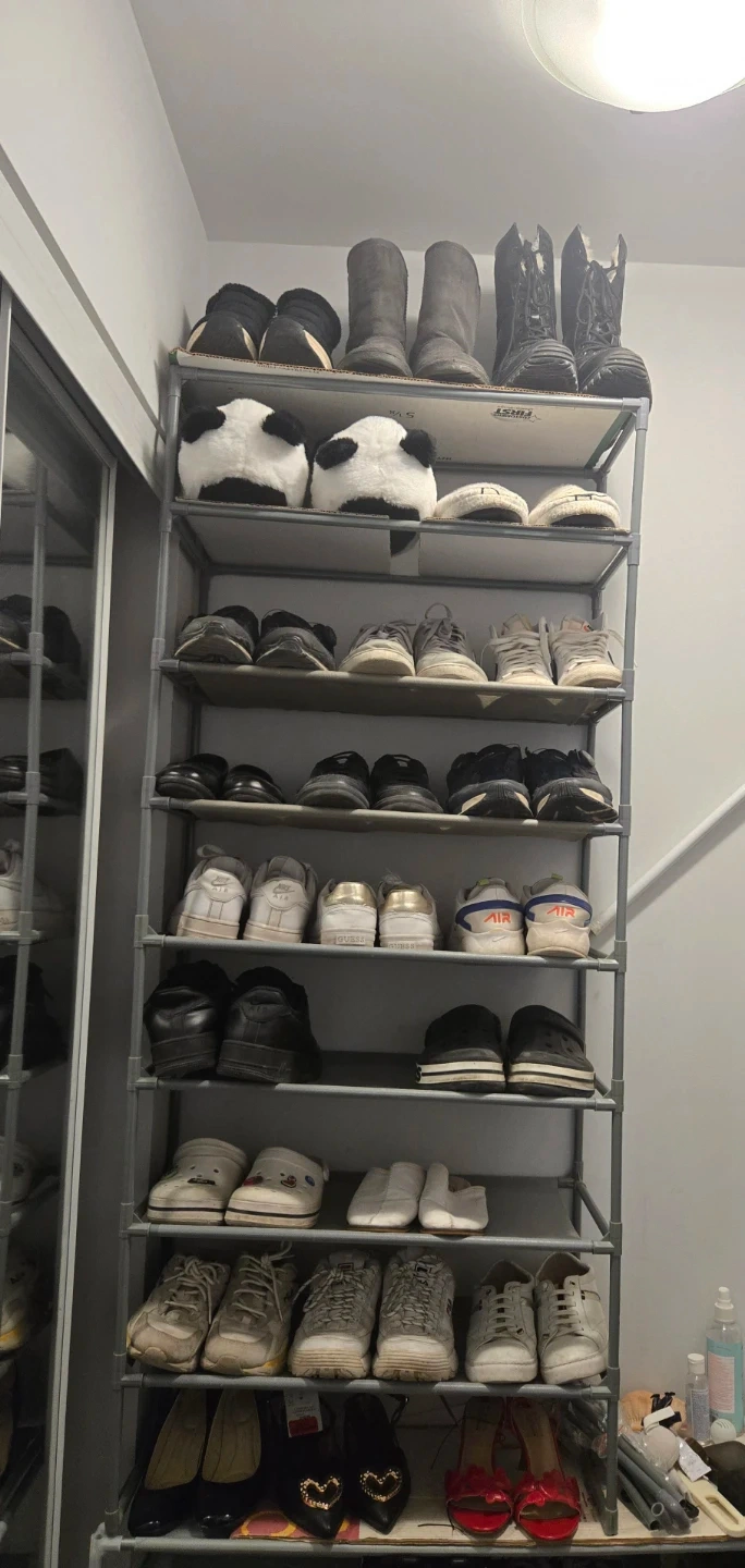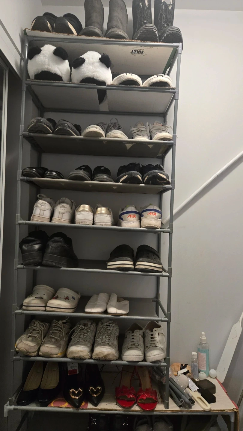 A tall, multi-tiered shoe rack that can hold numerous pairs of shoes. It's made of a metal frame with fabric shelves. This rack is great for organizing footwear in a closet or entryway.