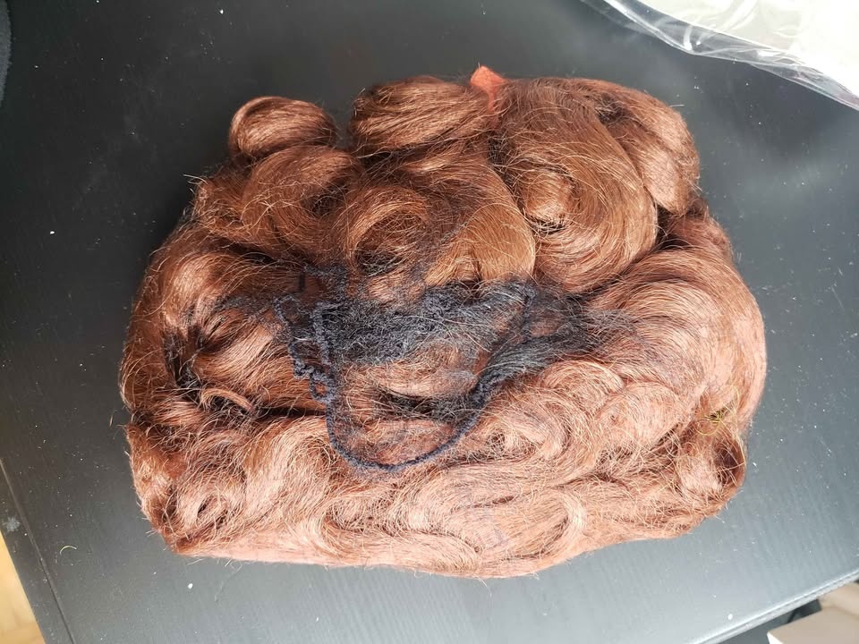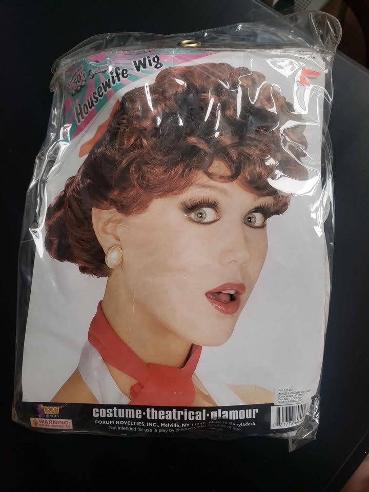 Assorted wigs including lime green bob, purple bob, brown curly with bangs, pink wavy with bangs, pink pixie/bob, and an auburn housewife wig with an orange bow. Also includes a witches hat, angel and tinsel headband, and sweat bands. Sold as a lot. Pick up in the Queen and John area.