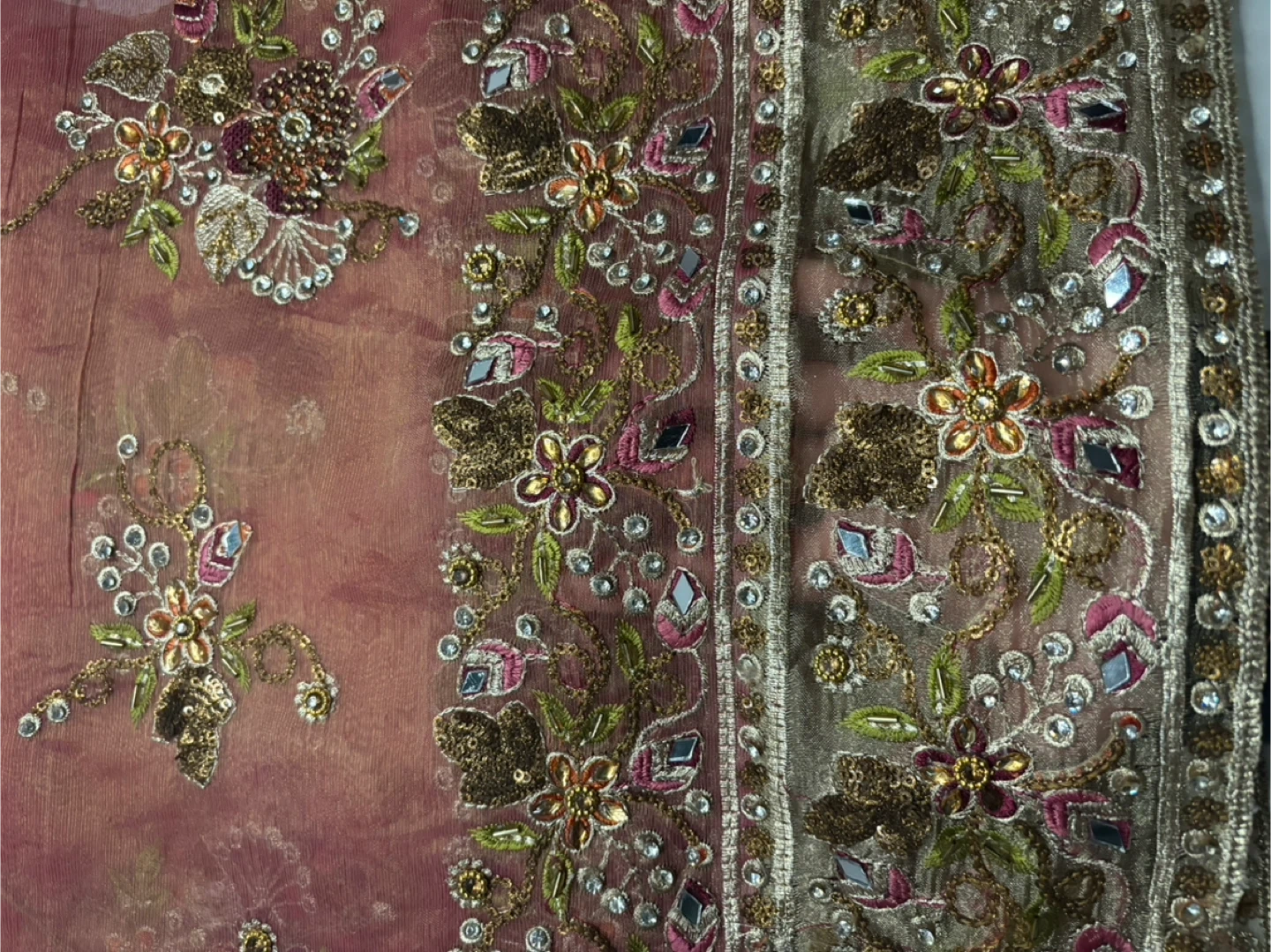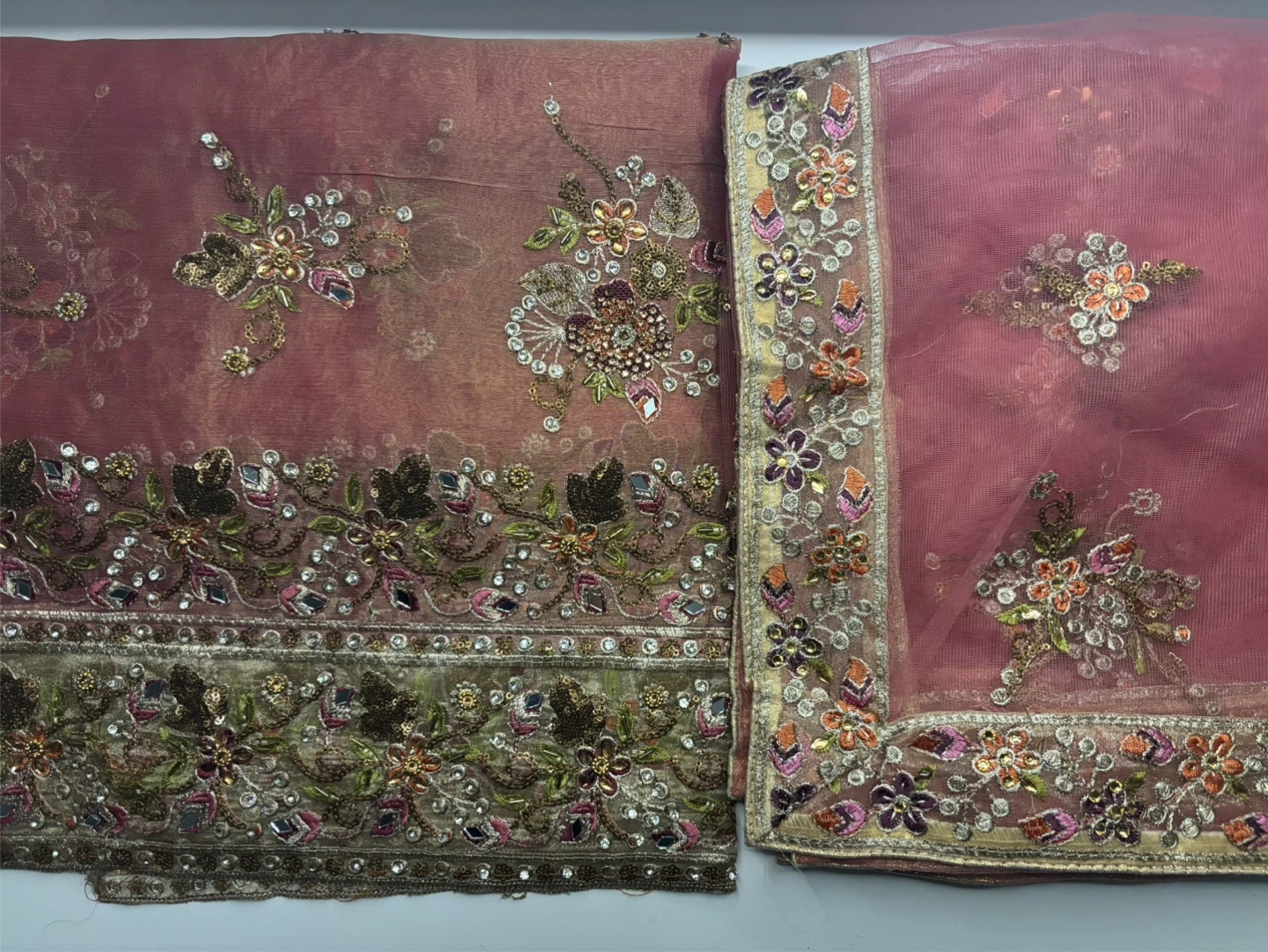Selling a beautiful pink net suit with intricate floral embroidery and a decorative border on front/back. This piece is perfect for adding a touch of elegance to any outfit or occasion. Mirrorwork/beadwork.