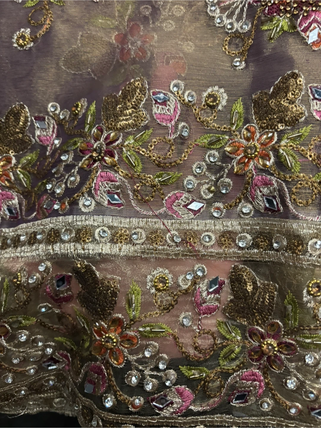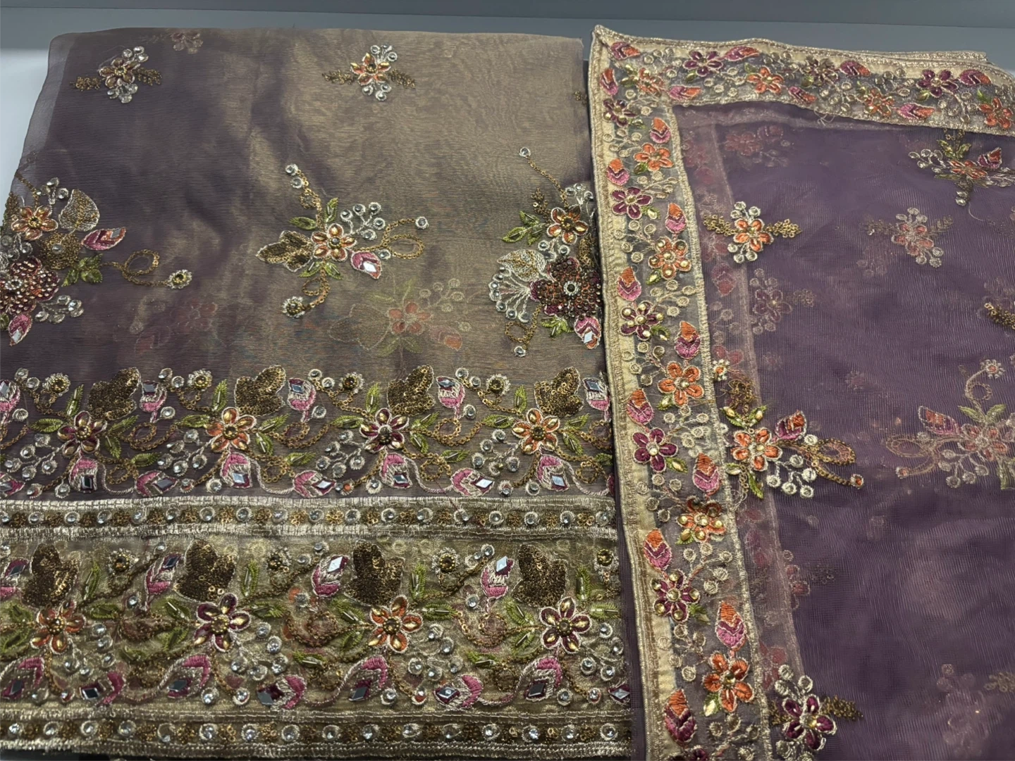 15Selling this beautiful embroidered net unstitched. The intricate floral designs and delicate beadwork/mirrorwork make it perfect for party-wear events. The fabric has a lovely subtle sheen. Front and back is embroidered. Full Suit.