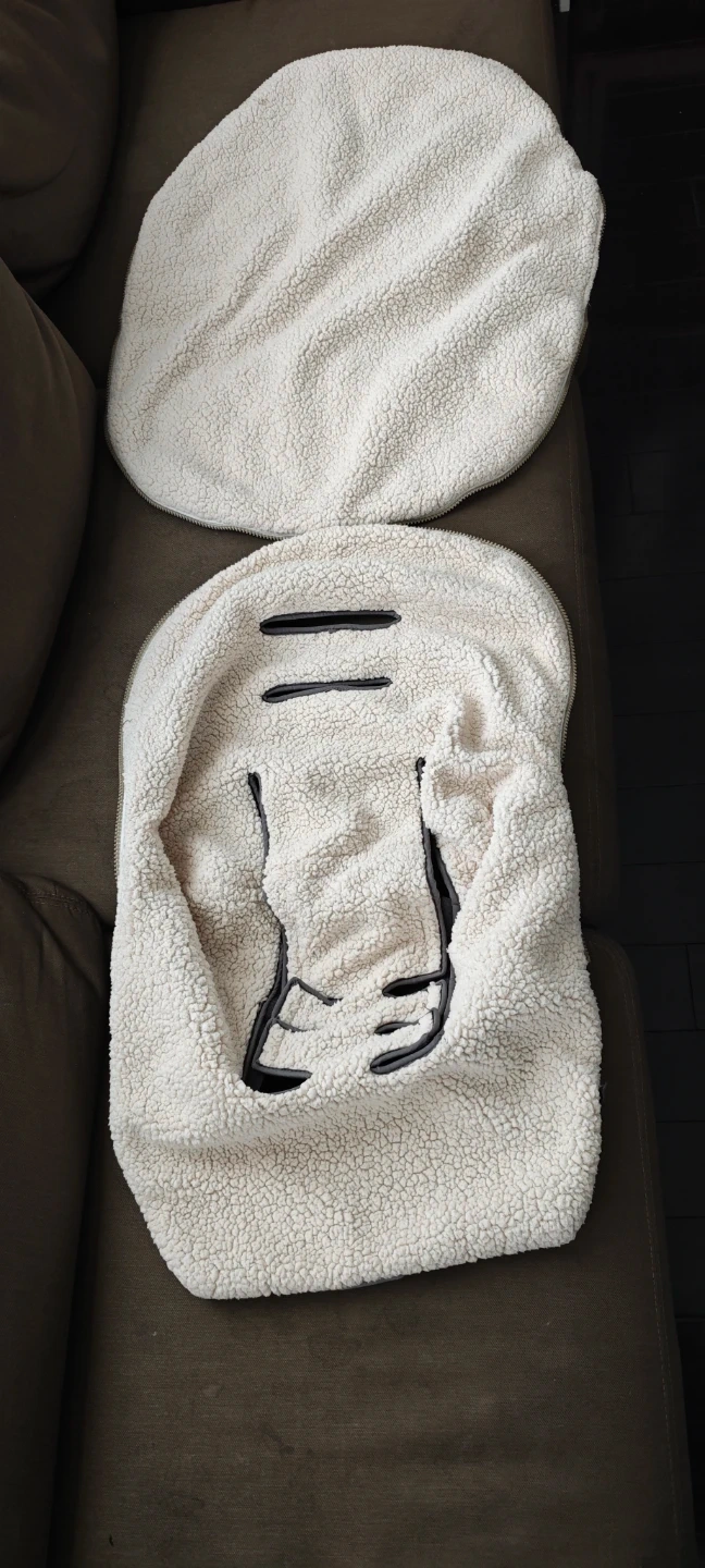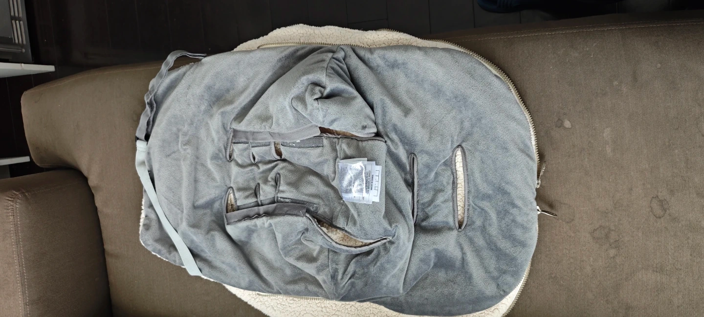 This is a grey fleece lined car seat cover with a plush interior. It's designed to fit most infant car seats, keeping your little one warm and cozy. The cover has a full zipper closure for easy access.
