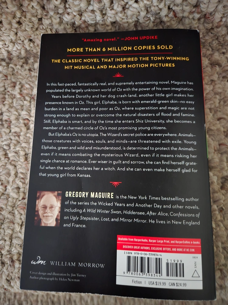 Paperback book by Gregory Maguire. New York Times bestseller. Volume one in the Wicked Years series. Purchased for a gift but they already had the book. Just want to safe the hassle at the store.