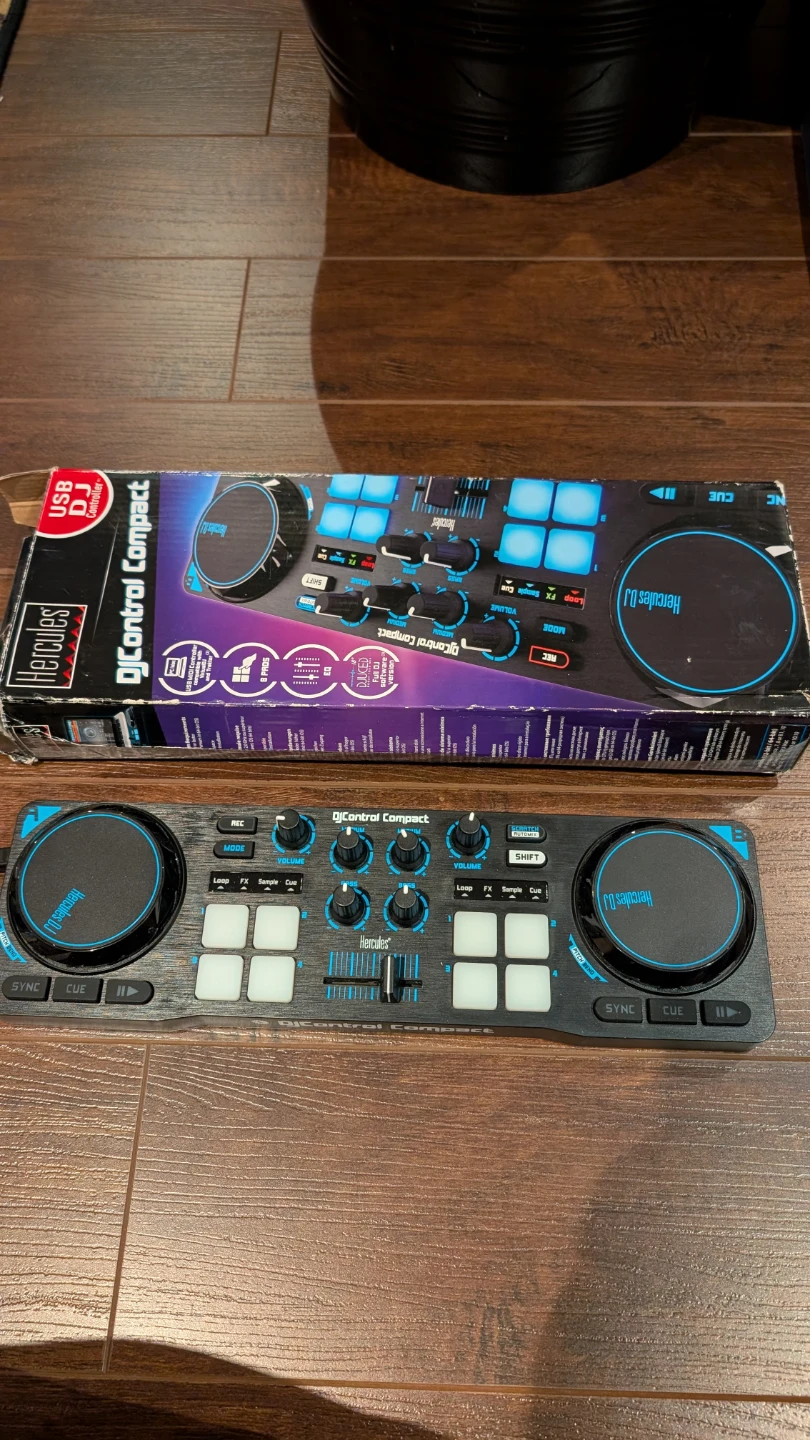 Selling a Hercules DJControl Compact USB DJ Controller in great condition! It's a two-deck DJ controller that's USB bus-powered, making it super portable. Comes with the box!