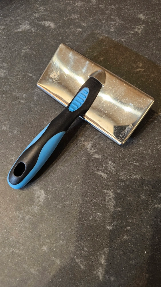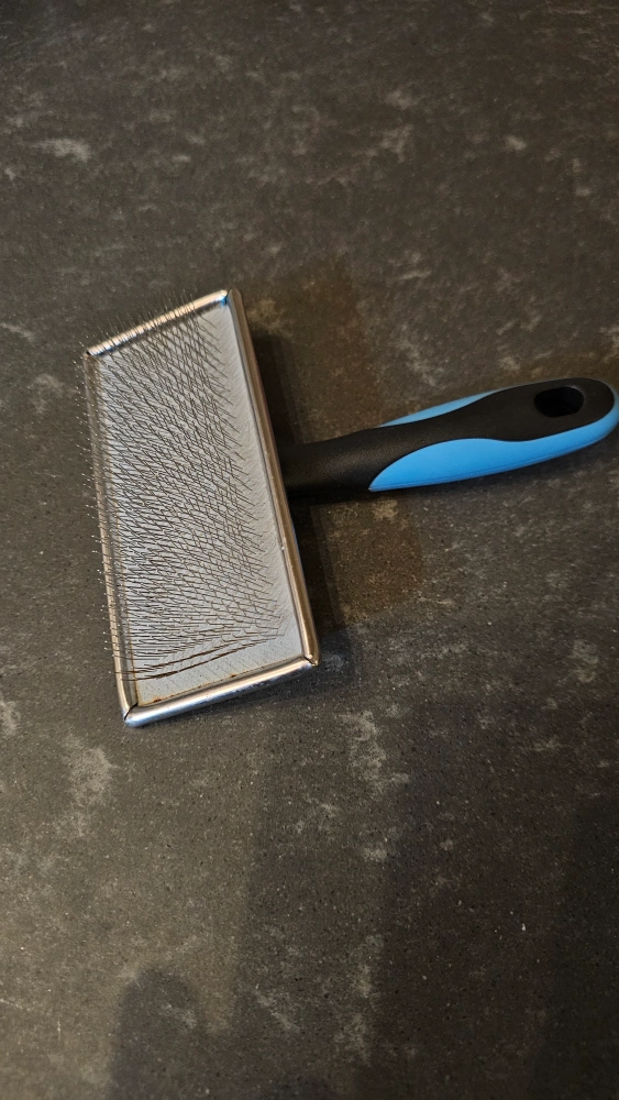 Like new pet grooming brush. Stainless steel head with flexible metal bristles. Black and blue plastic handle with comfortable grip. Great for removing loose fur and undercoat. Part of a pet gift box but not appropriate for our dog's breed and coat. Pick up in Queen West.