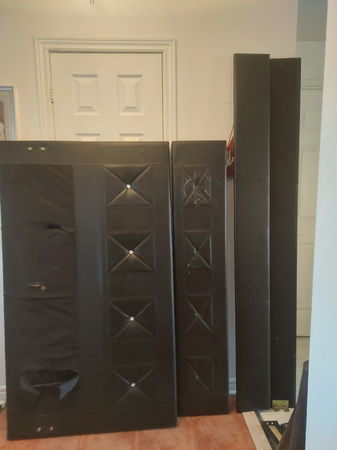 This is a faux leather headboard with diamond tufting and crystal button accents. It appears to be for a queen or king-sized bed frame. Some minor scuffs are present on one panel.