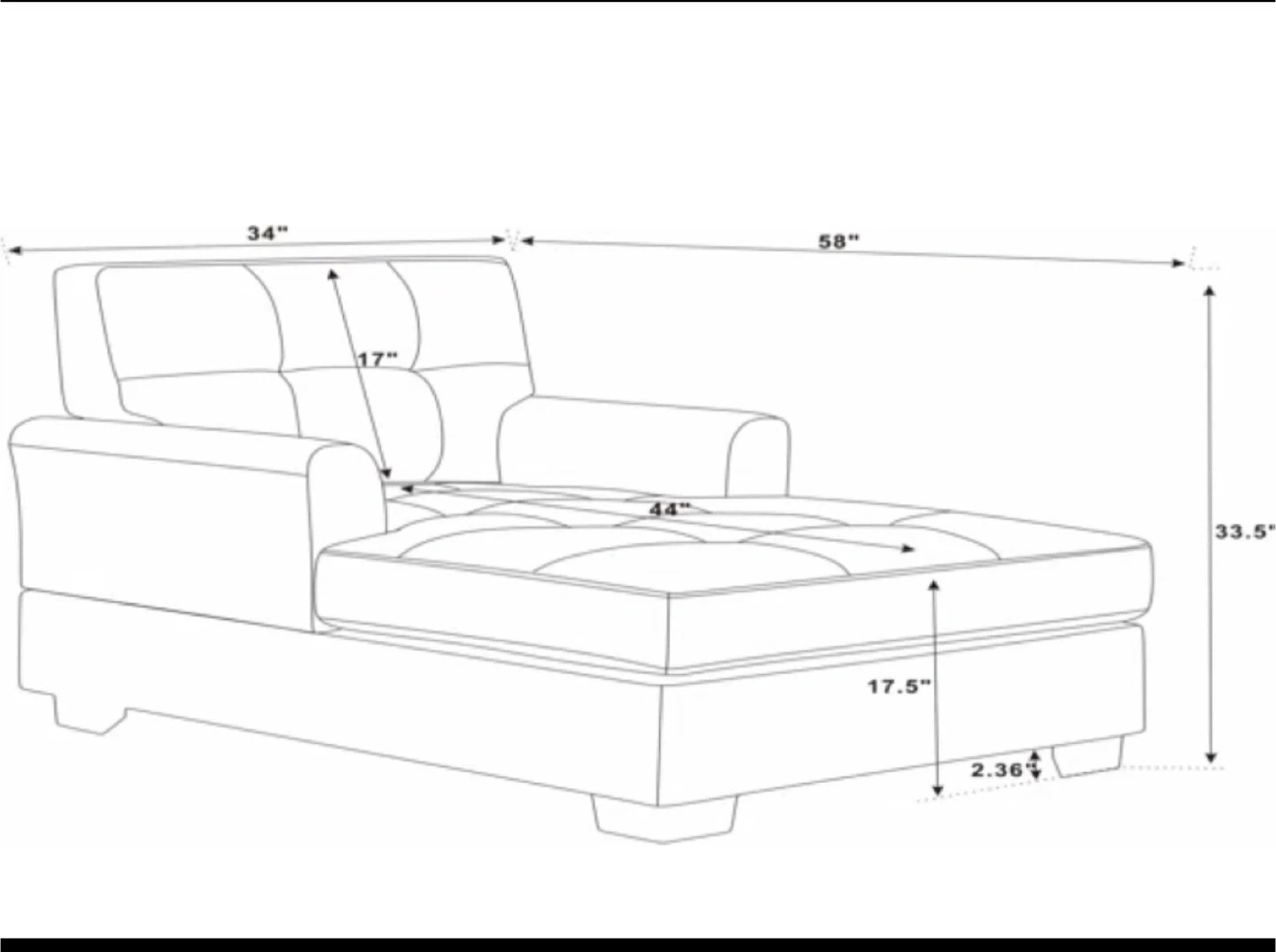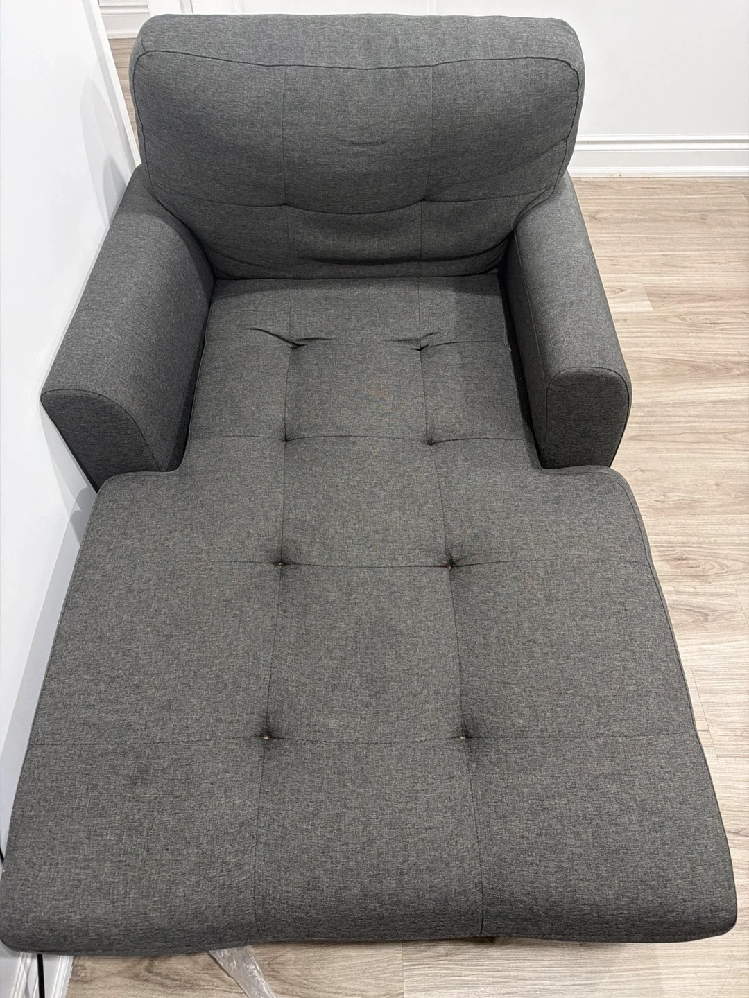 This grey chaise lounge features tufted detailing for a stylish look. It's made from durable fabric and offers a comfortable place to recline. It's well-suited for a living room or bedroom.