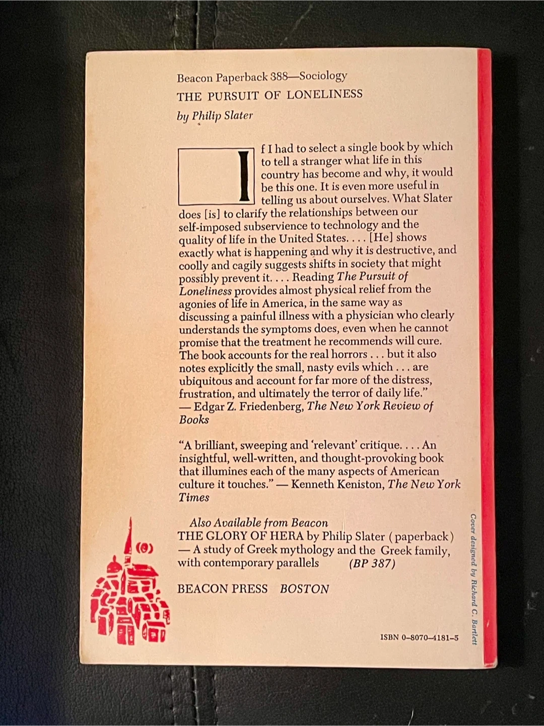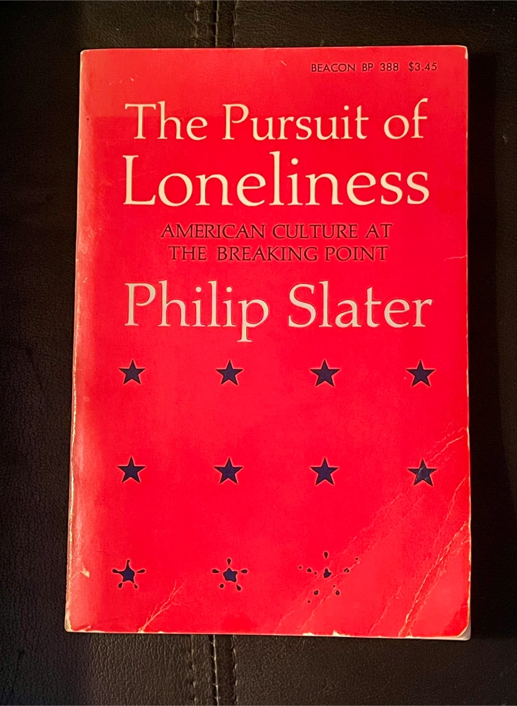 This is Philip Slater's 1972 softcover book, The Pursuit of Loneliness. It's about American culture at the breaking point. The book explores self-imposed subservience to technology and the quality of life in the United States. It offers insights into society's shifts and their potential prevention.