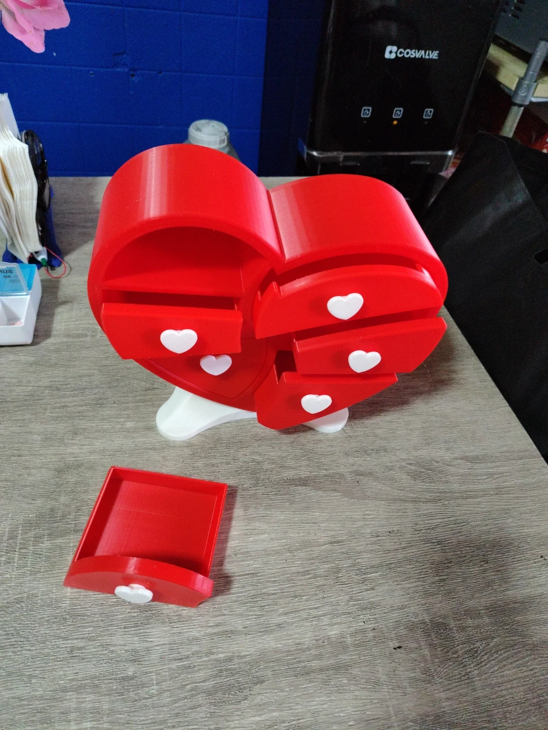 Selling a cute red heart-shaped drawer organizer! It has several small drawers, each adorned with a white heart. Perfect for storing small items like jewelry or craft supplies