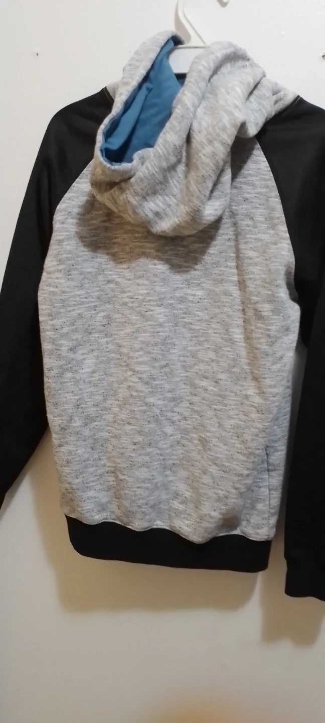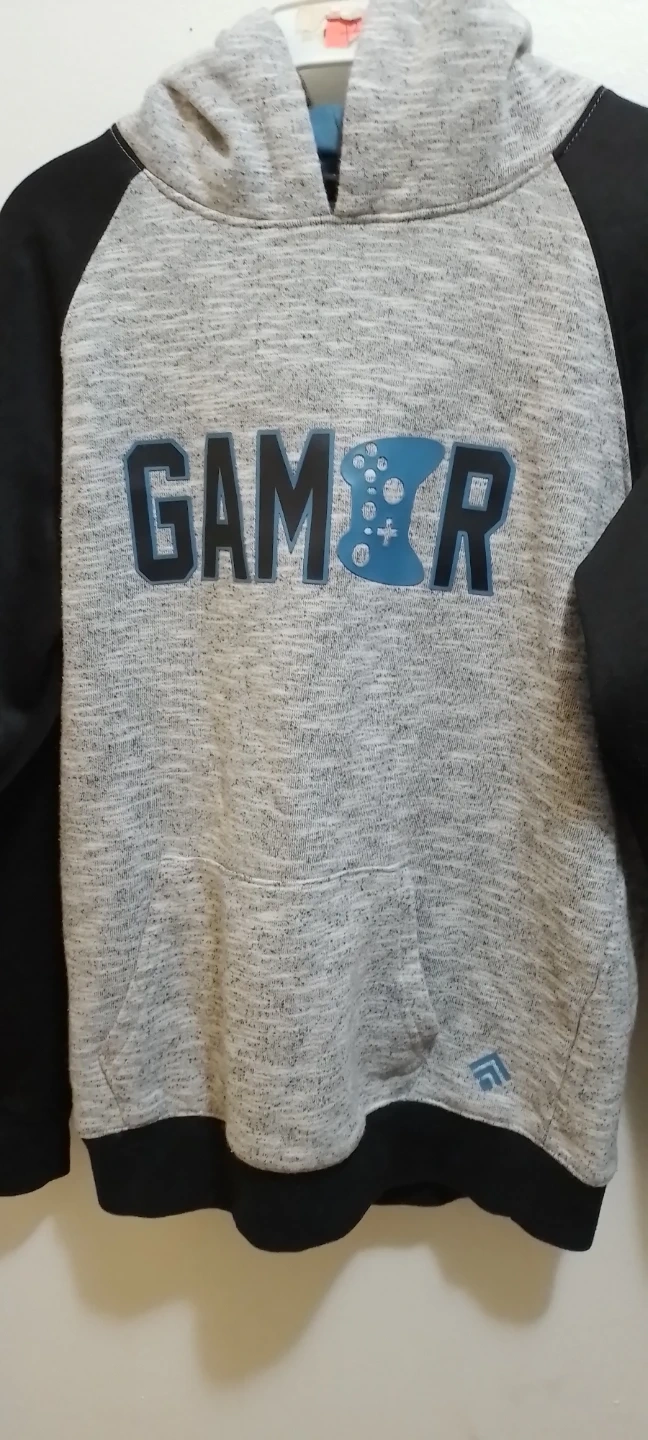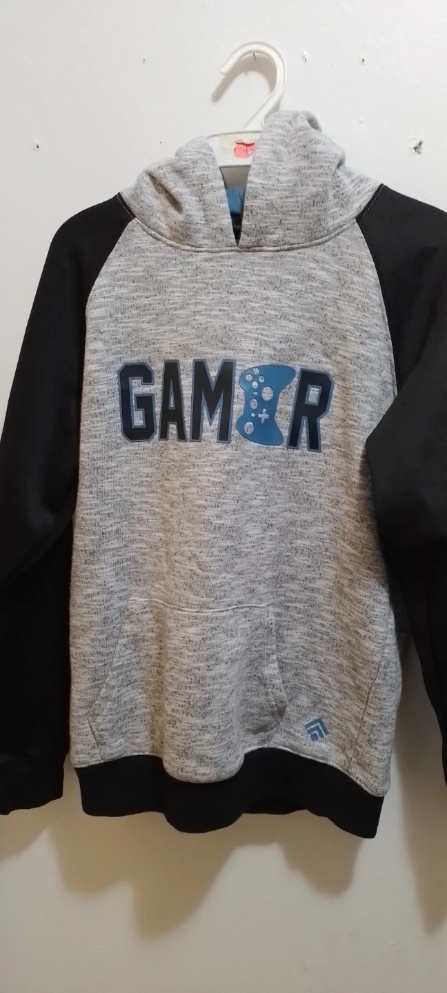 Grey and black raglan sleeve hoodie with a "Gamer" graphic and controller design. It features a front pouch pocket and a blue lined hood. This hoodie is made from a soft blend of materials.