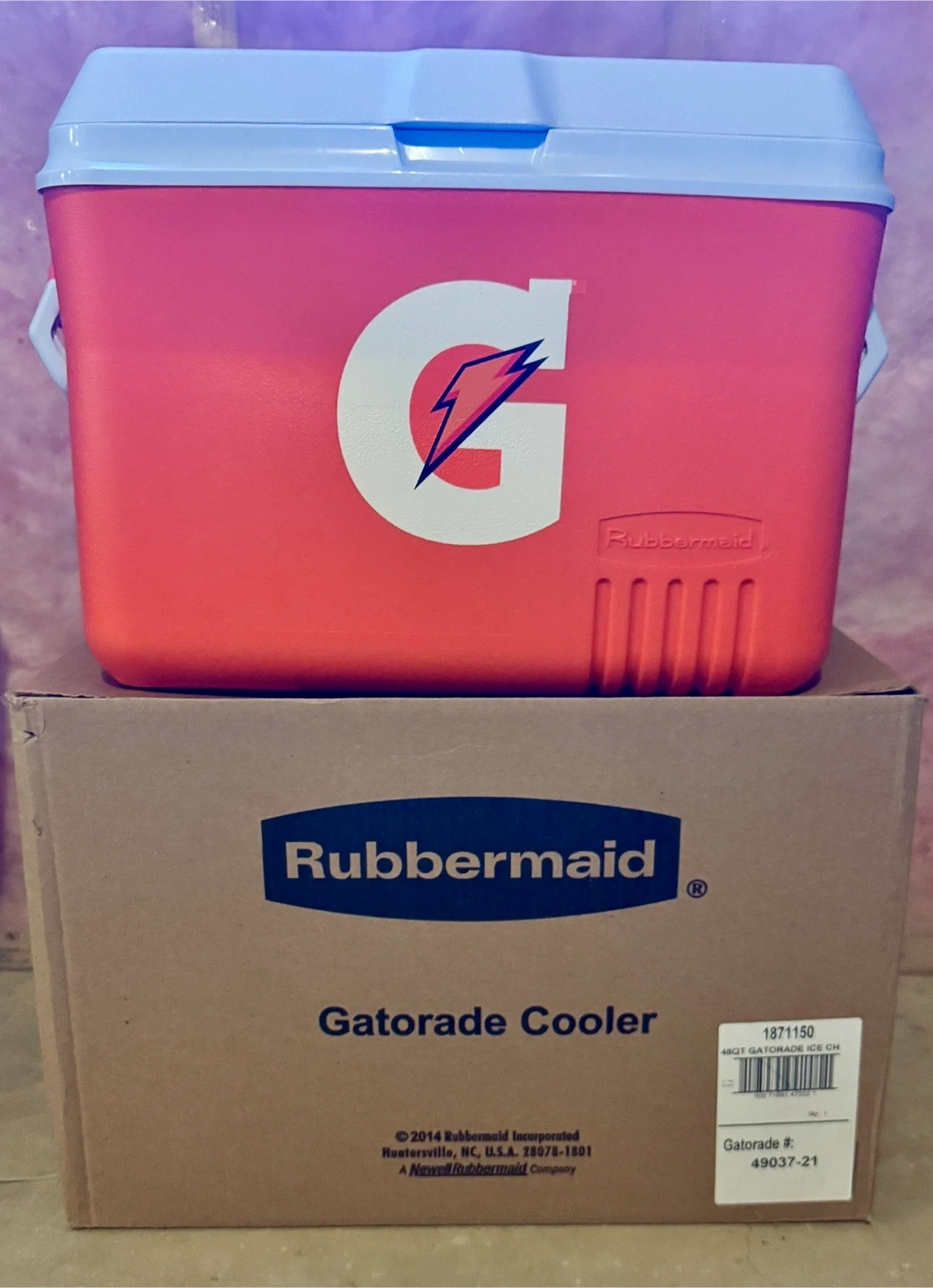This is a red and blue 48-quart Gatorade cooler by Rubbermaid. It has the iconic Gatorade G logo on the side. It's perfect for keeping drinks and snacks cool on the go, whether at sports events or picnics!