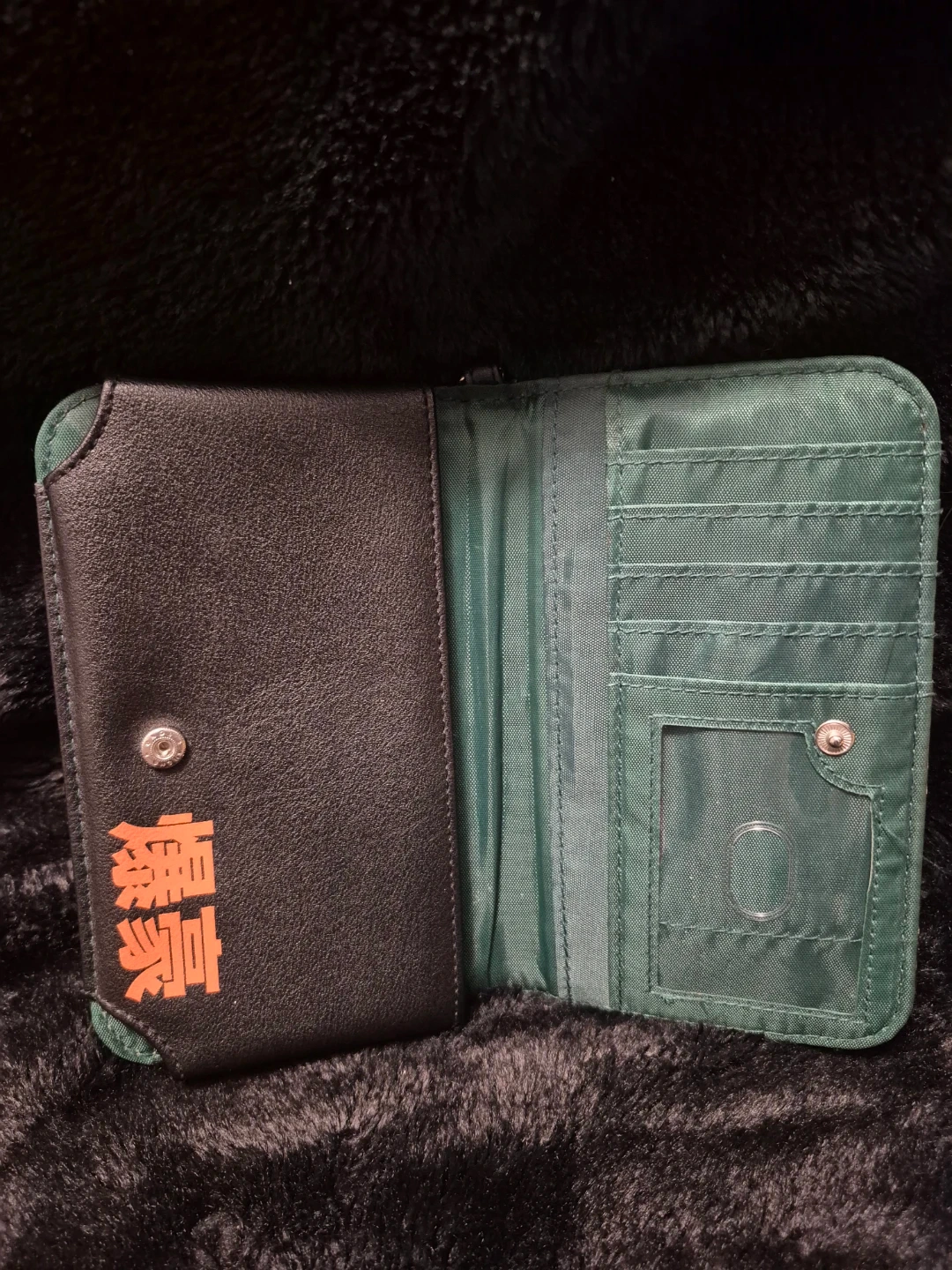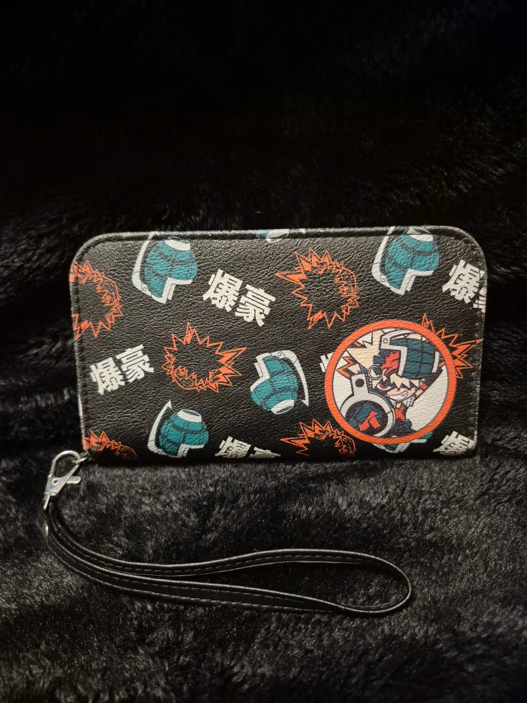 This black bifold wallet features an all-over print with Katsuki Bakugo symbols. It has multiple card slots, a clear ID window, and a zippered coin pocket. A wrist strap is attached for convenience.