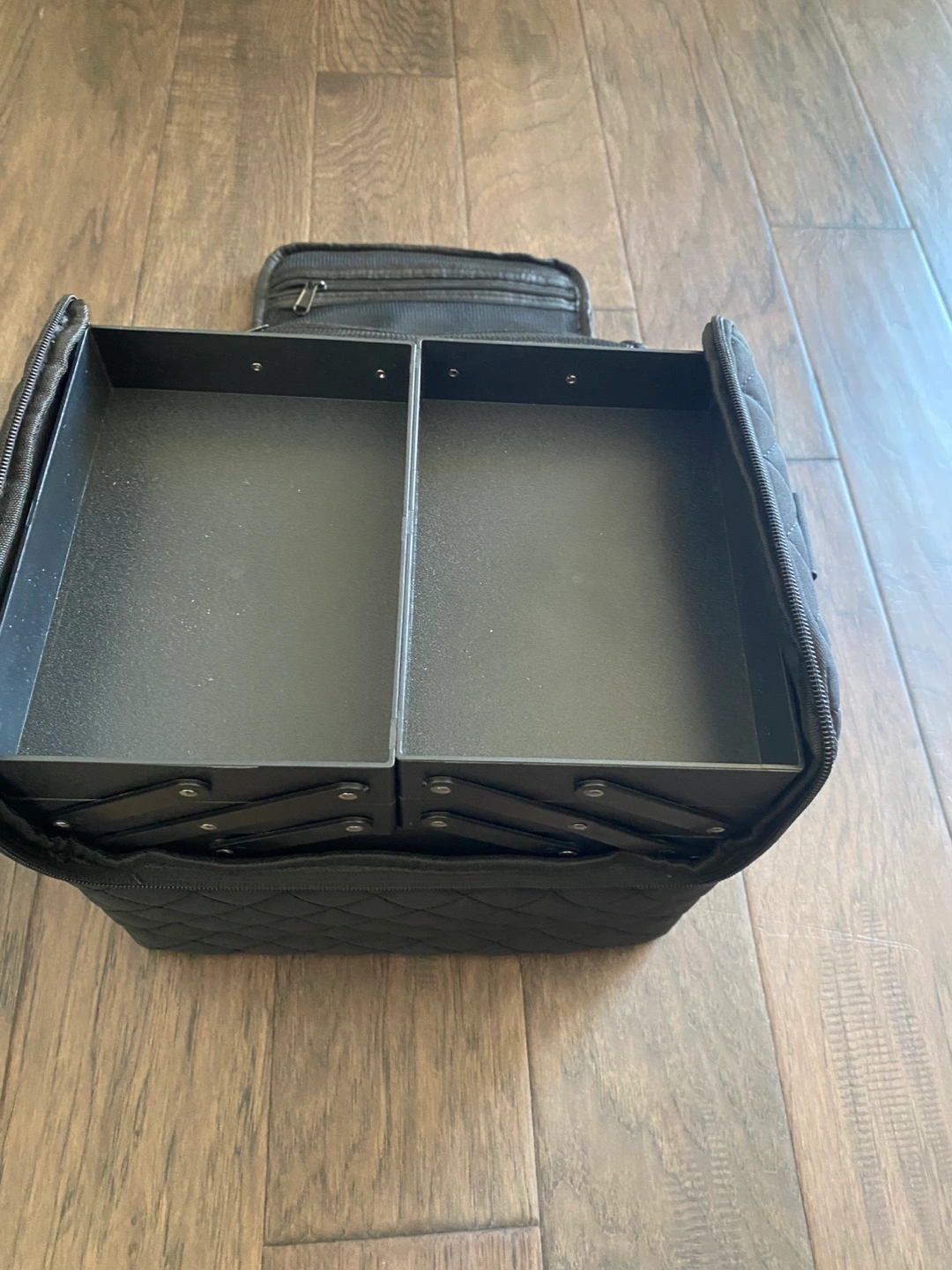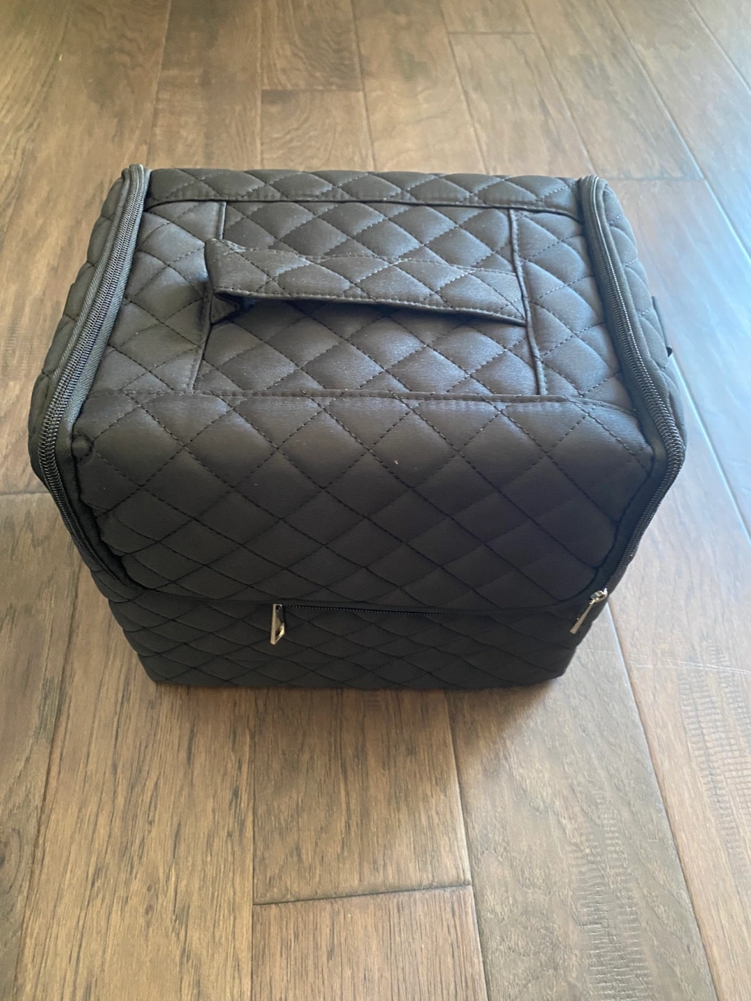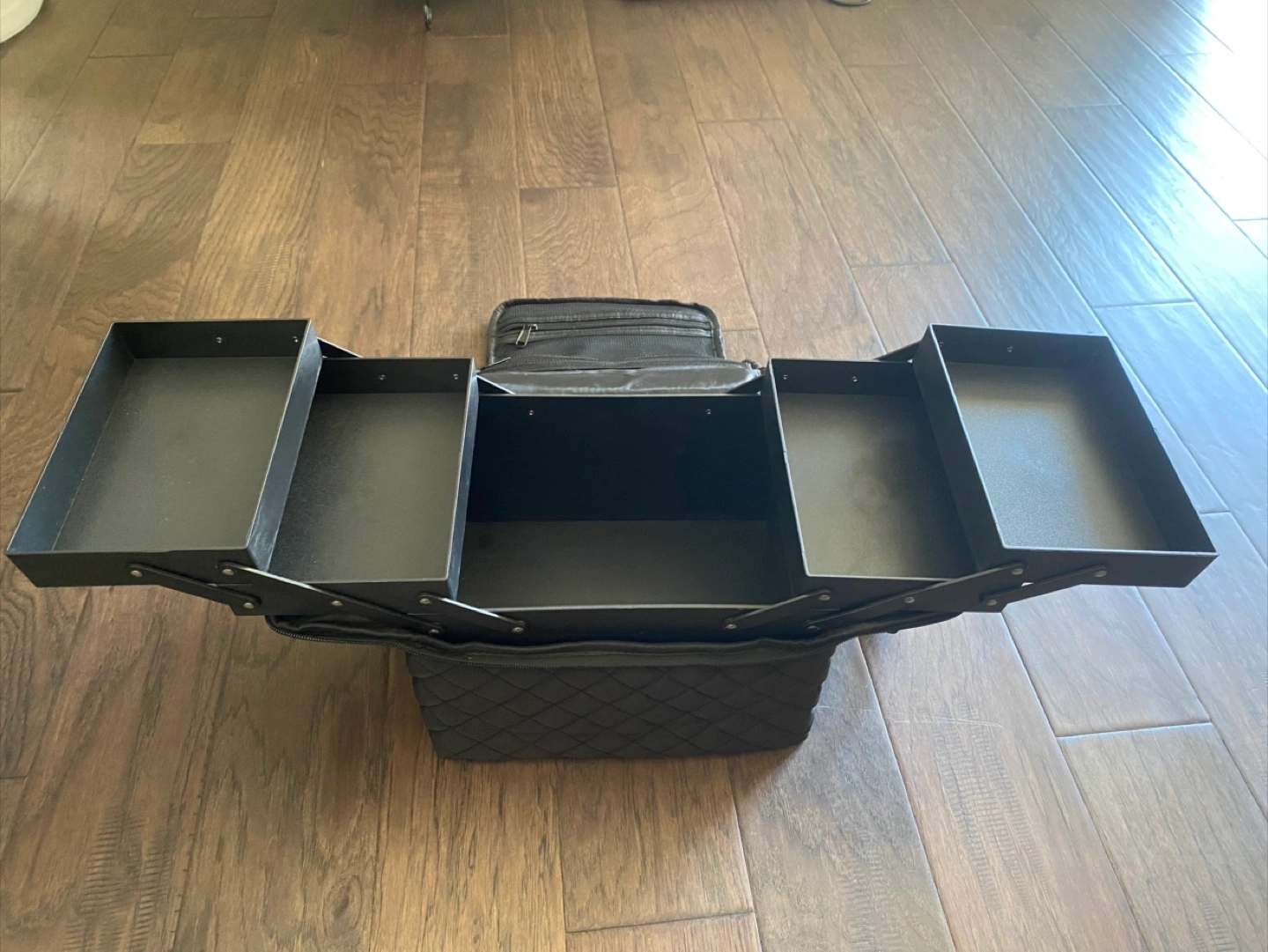 A makeup train case. Black, quilted exterior. Multiple pull-out trays. Convenient storage for all your cosmetics. Perfect for organizing your beauty essentials in a relaxing atmosphere.