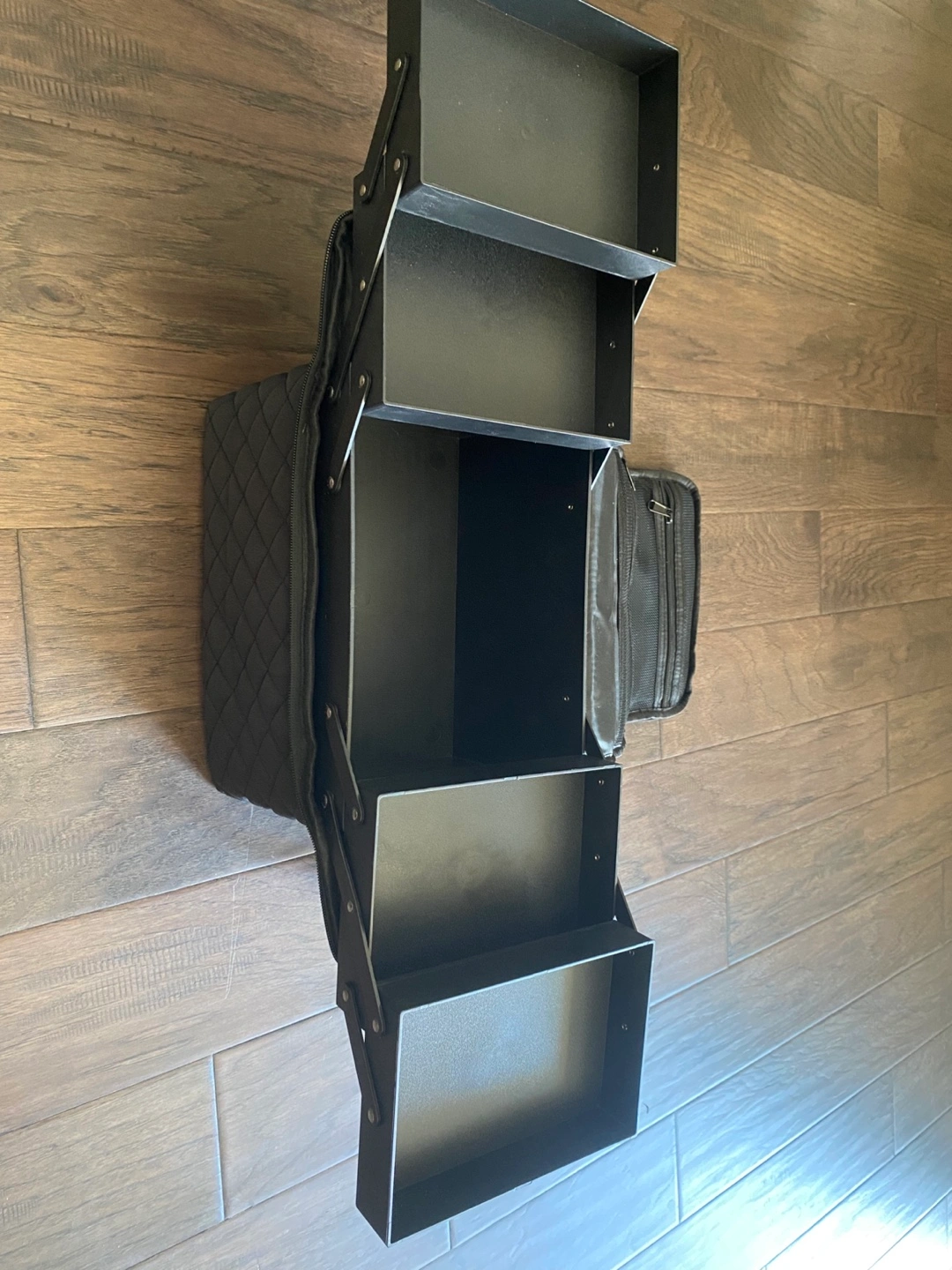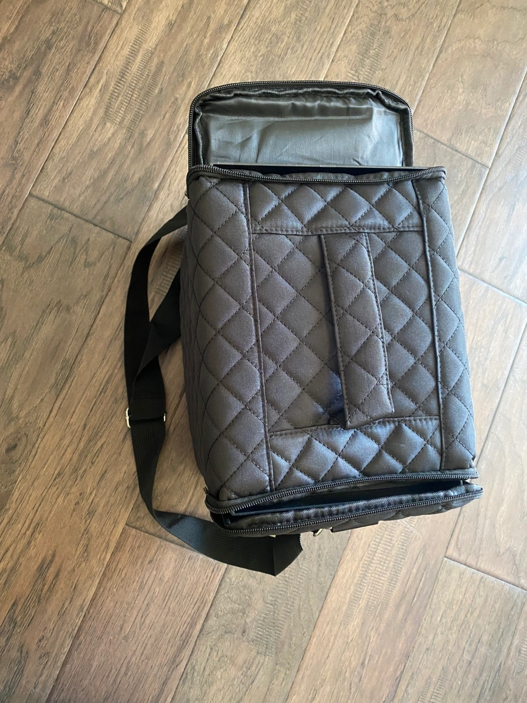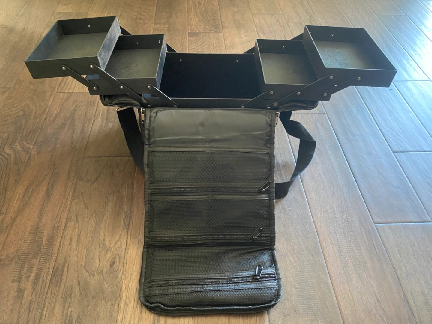 A makeup train case. Black, quilted exterior. Multiple pull-out trays. Convenient storage for all your cosmetics. Perfect for organizing your beauty essentials in a relaxing atmosphere.