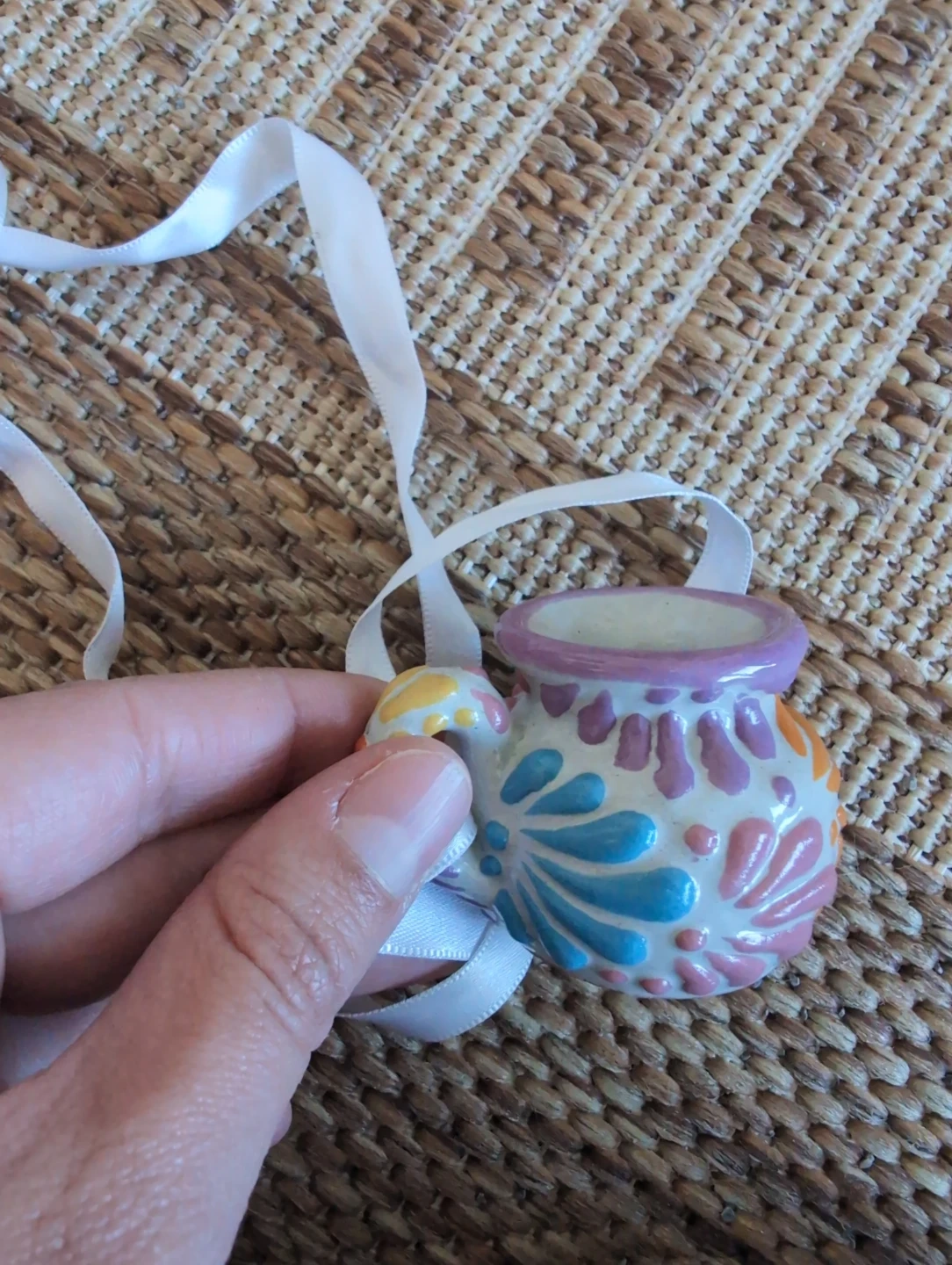 Cute decorative ceramic mini pot with a colourful floral design. It's got a white ribbon loop for hanging. Perfect for adding a little charm to a small space!