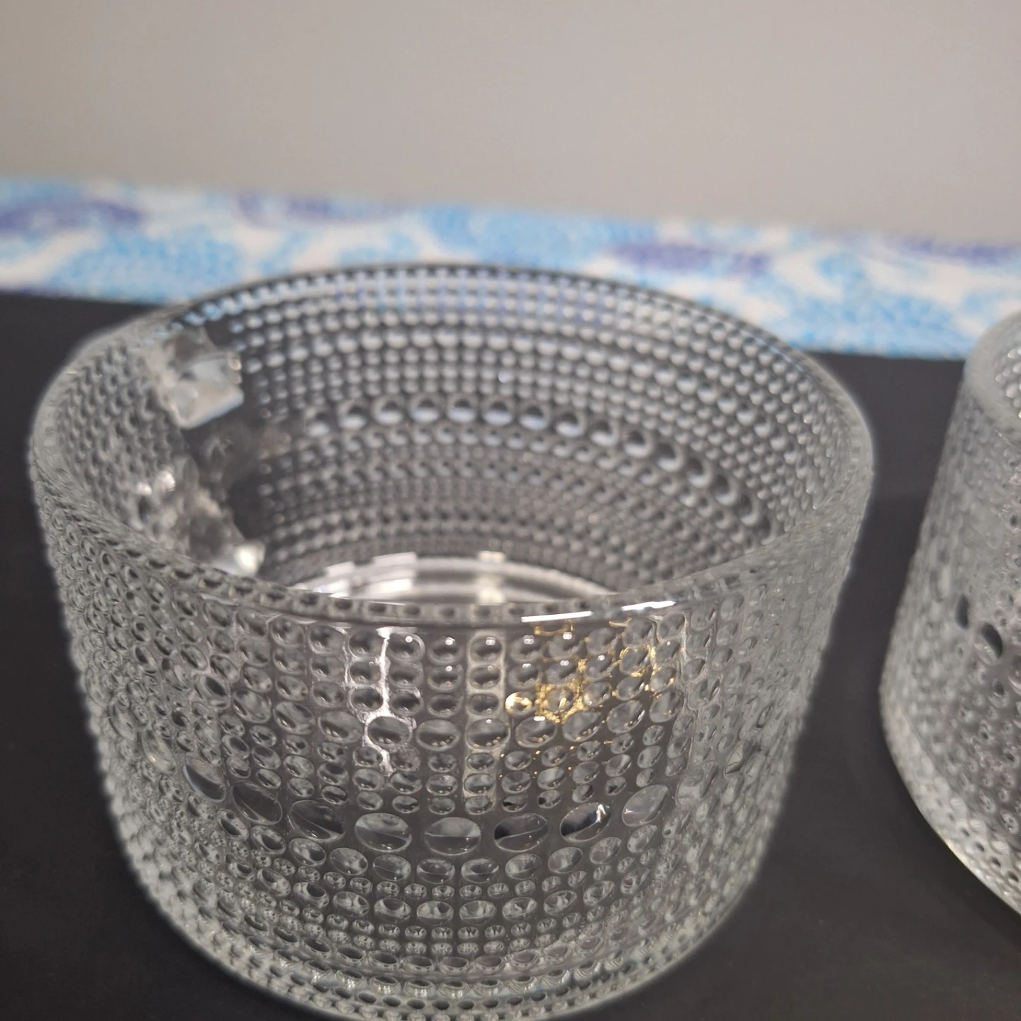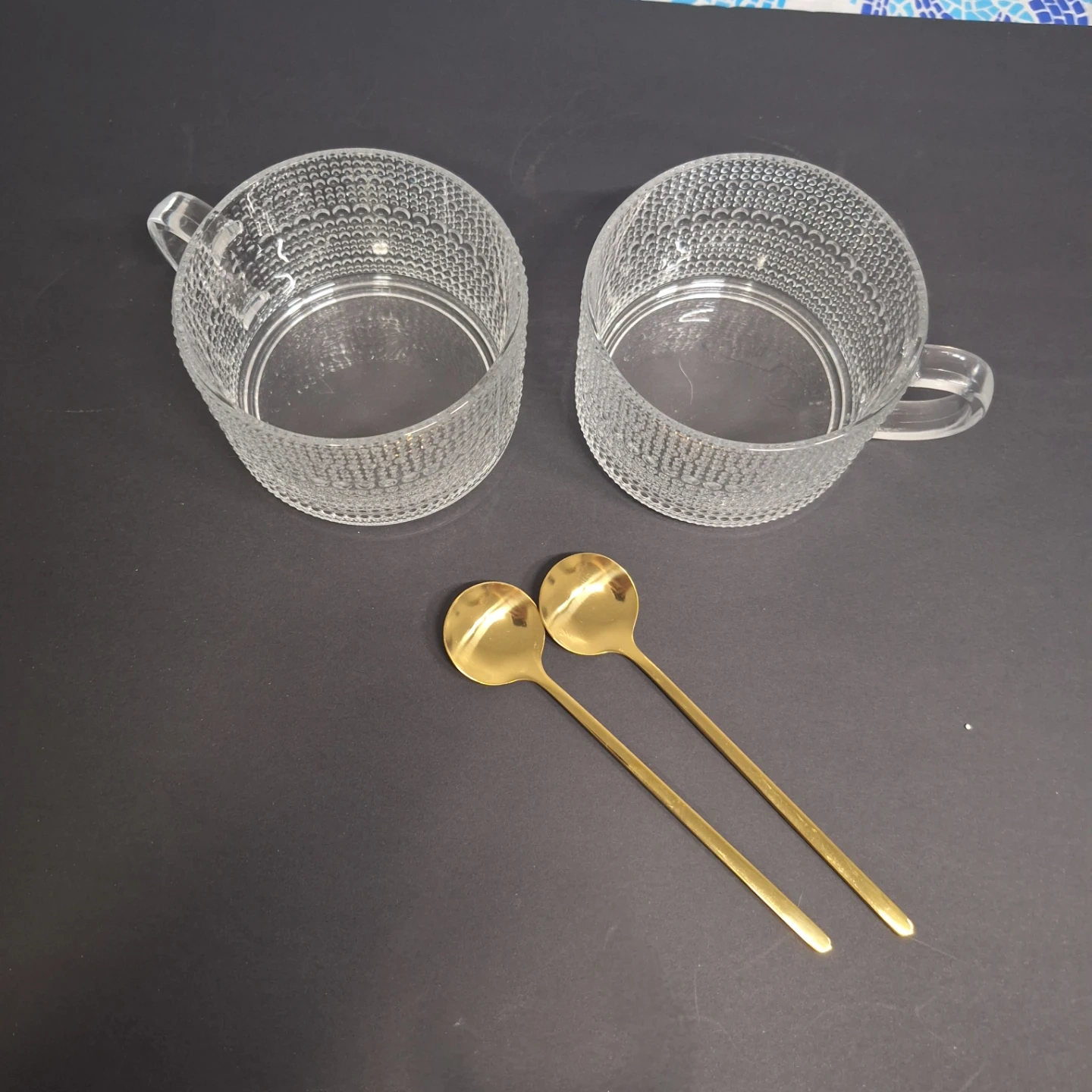 Two clear glass mugs with a textured pattern are included. Two gold-coloured spoons are also part of this set. These mugs are great for enjoying a warm beverage.