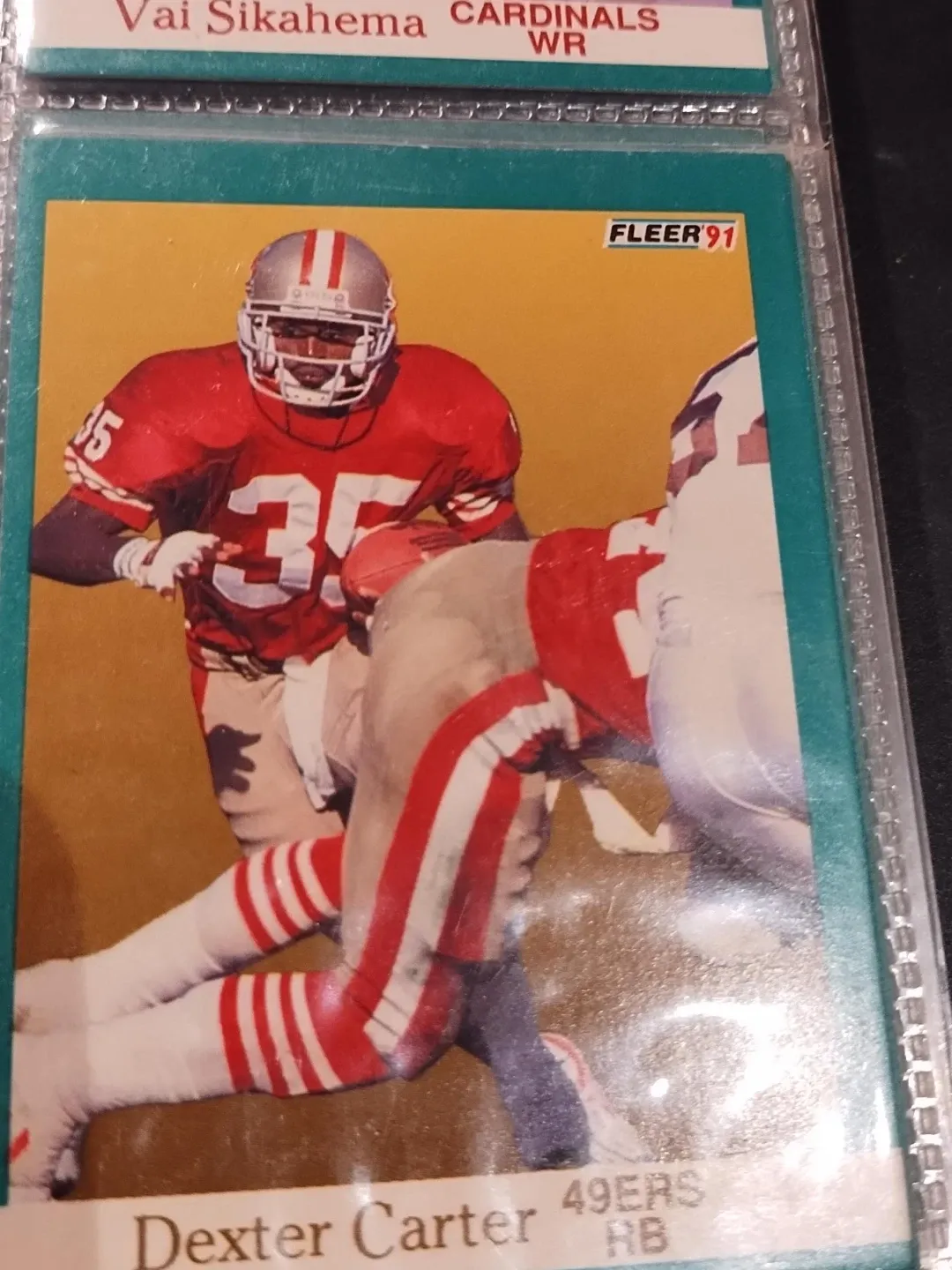This is a 1991 Fleer football card featuring Dexter Carter of the 49ers. He played as a running back (RB).