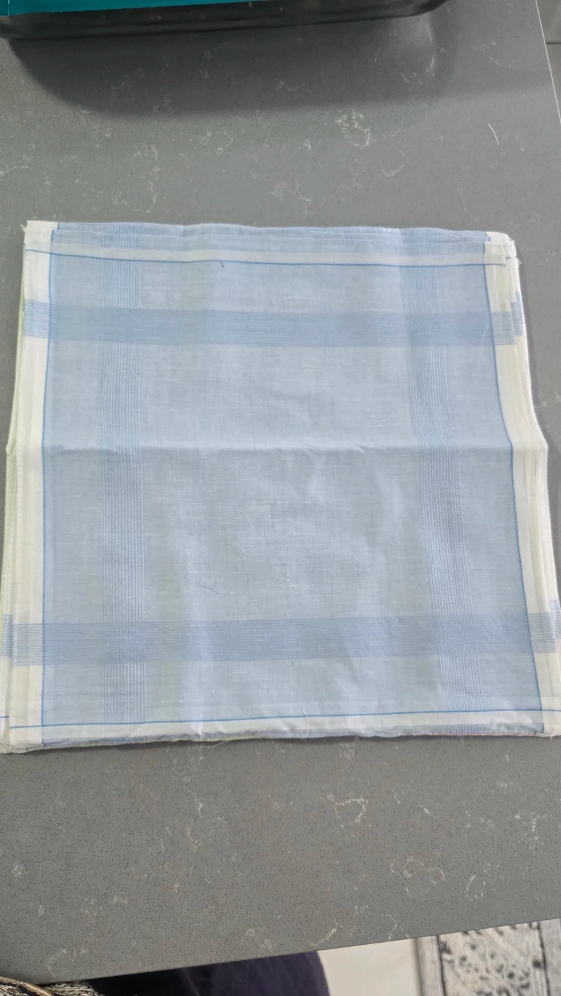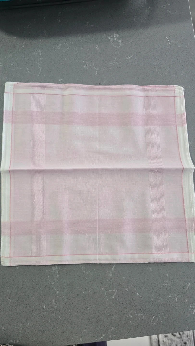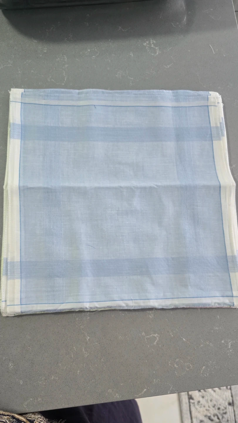 This is a set of dozen handkerchiefs, four in blue, four in green, and four in pink. They're made of a soft cotton fabric with a classic striped pattern. Each handkerchief measures approximately 16x16 inches.Also available in bulk.