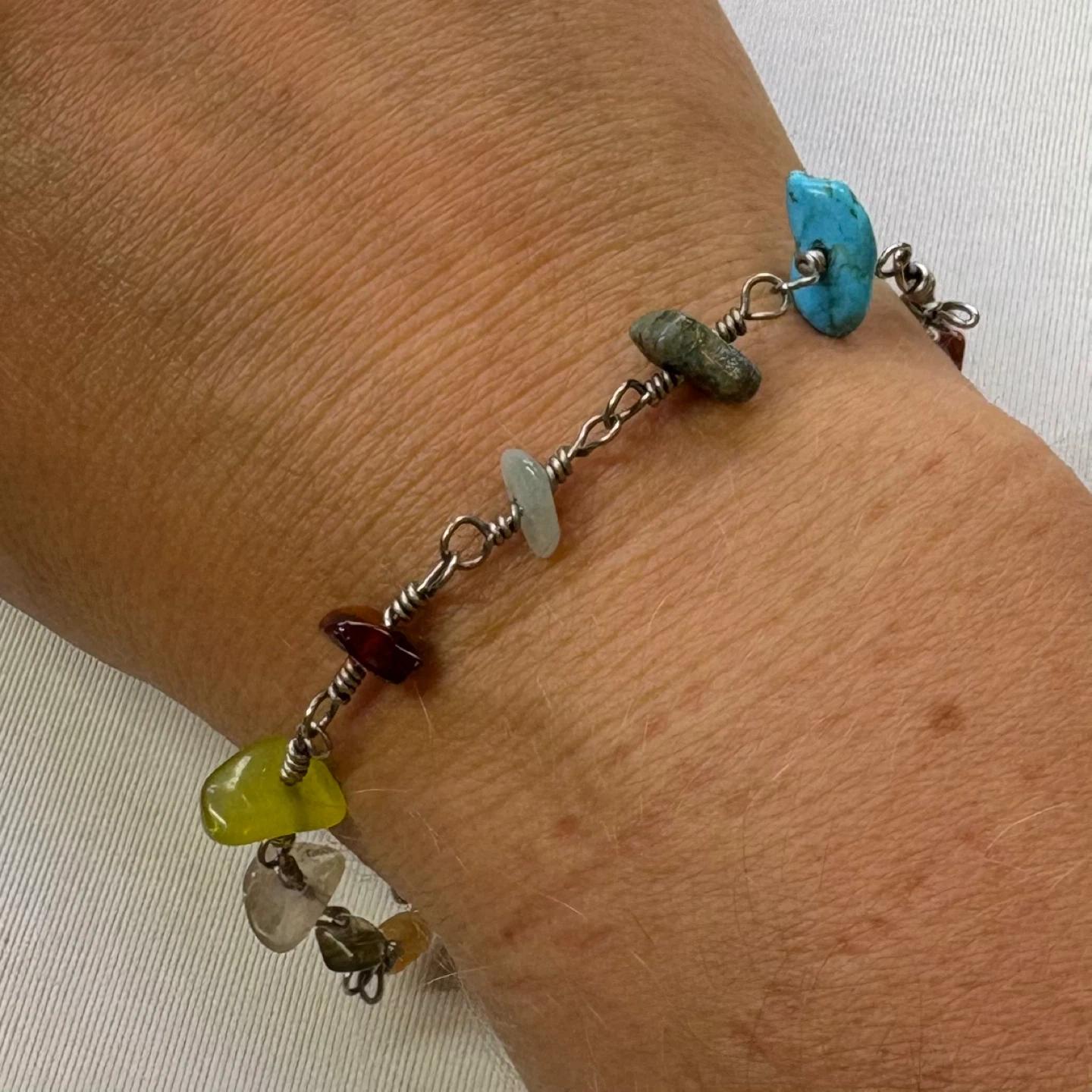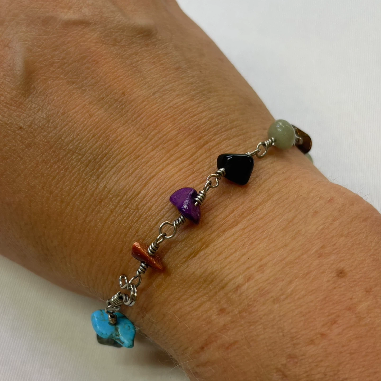 Keywords: handmade, bracelet, wire wrap, semi precious, stone, chip, multi color, silver, jewelry, boho, chic, unique, natural