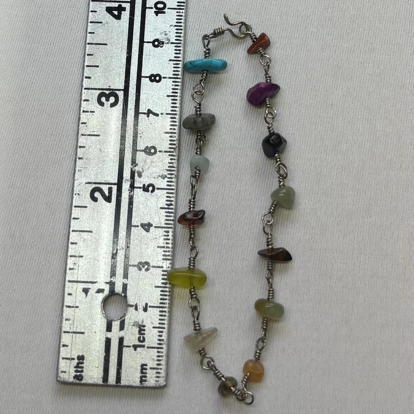 This unique and colorful bracelet is hand-crafted with semi-precious stone chips individually secured with silver tone wire. The natural, raw look of the stones gives this piece a beautiful boho or hippie chic aesthetic. Perfect for layering or wearing as a statement piece.