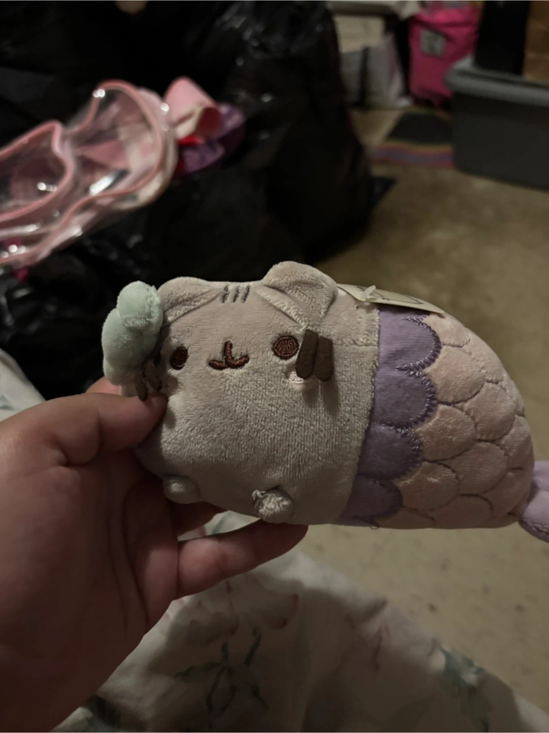It's a soft, grey Pusheen plush toy dressed as a mermaid. It has purple and tan scales along its back and a matching tail. This cute collectible is perfect for any Pusheen fan!