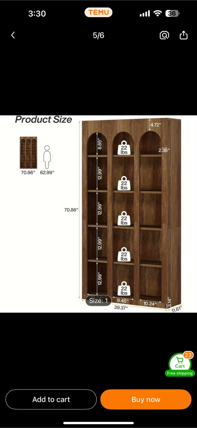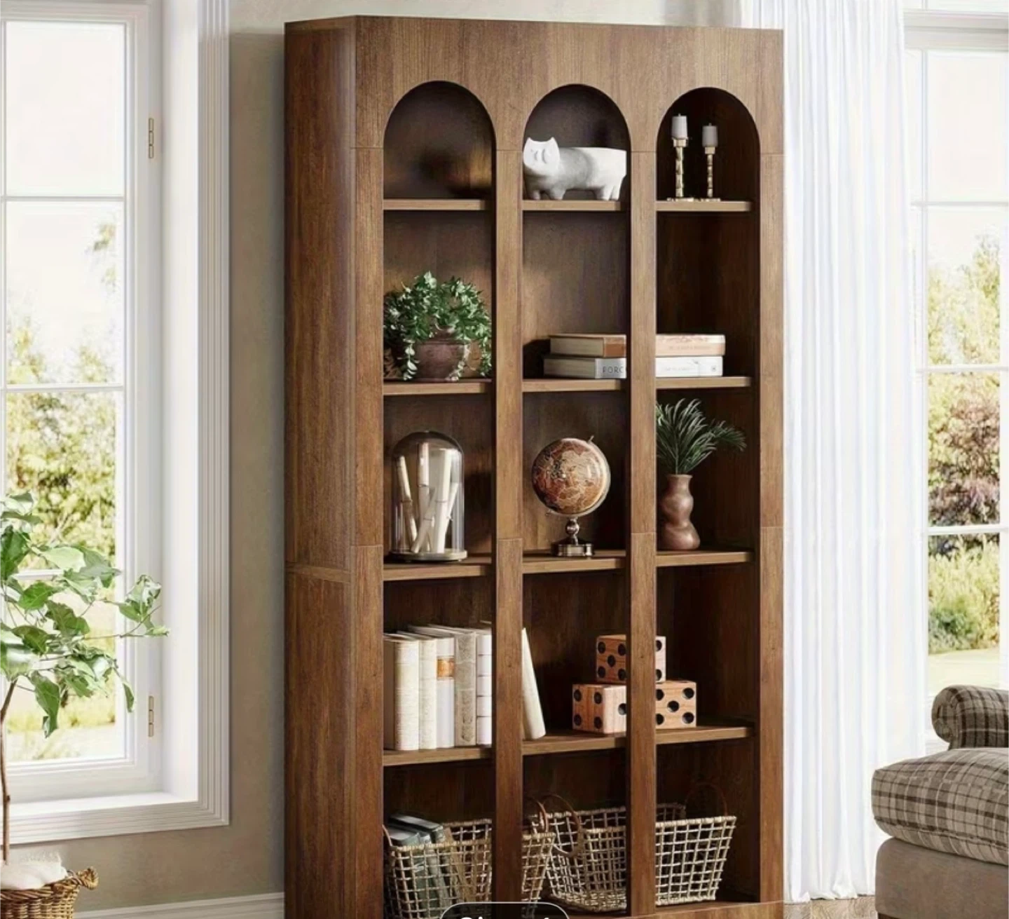 This tall bookshelf features three arched sections, providing ample display and storage space. It's constructed from durable wood with a warm finish. The overall dimensions are 70.86 inches high and 39.37 inches wide.
