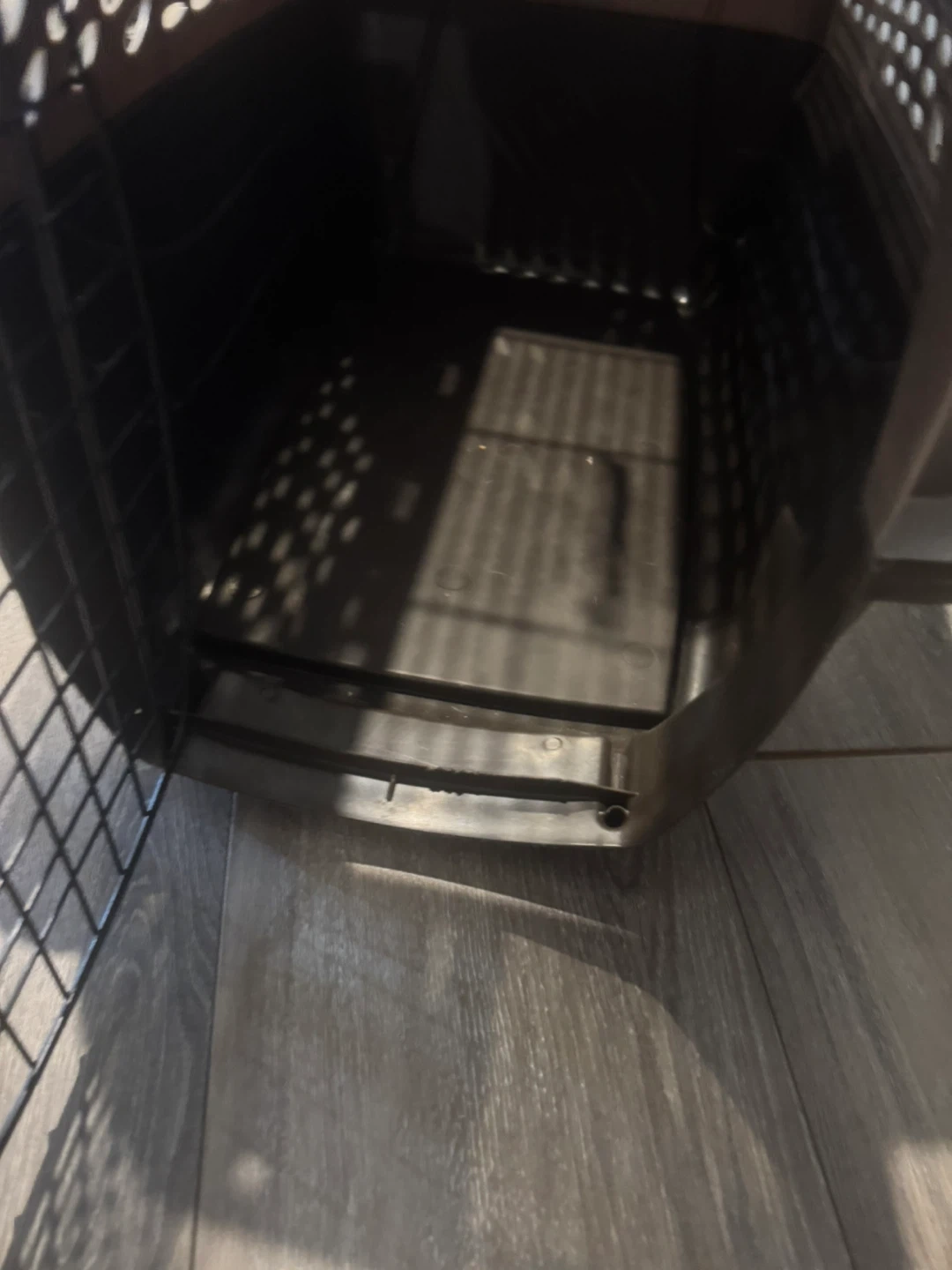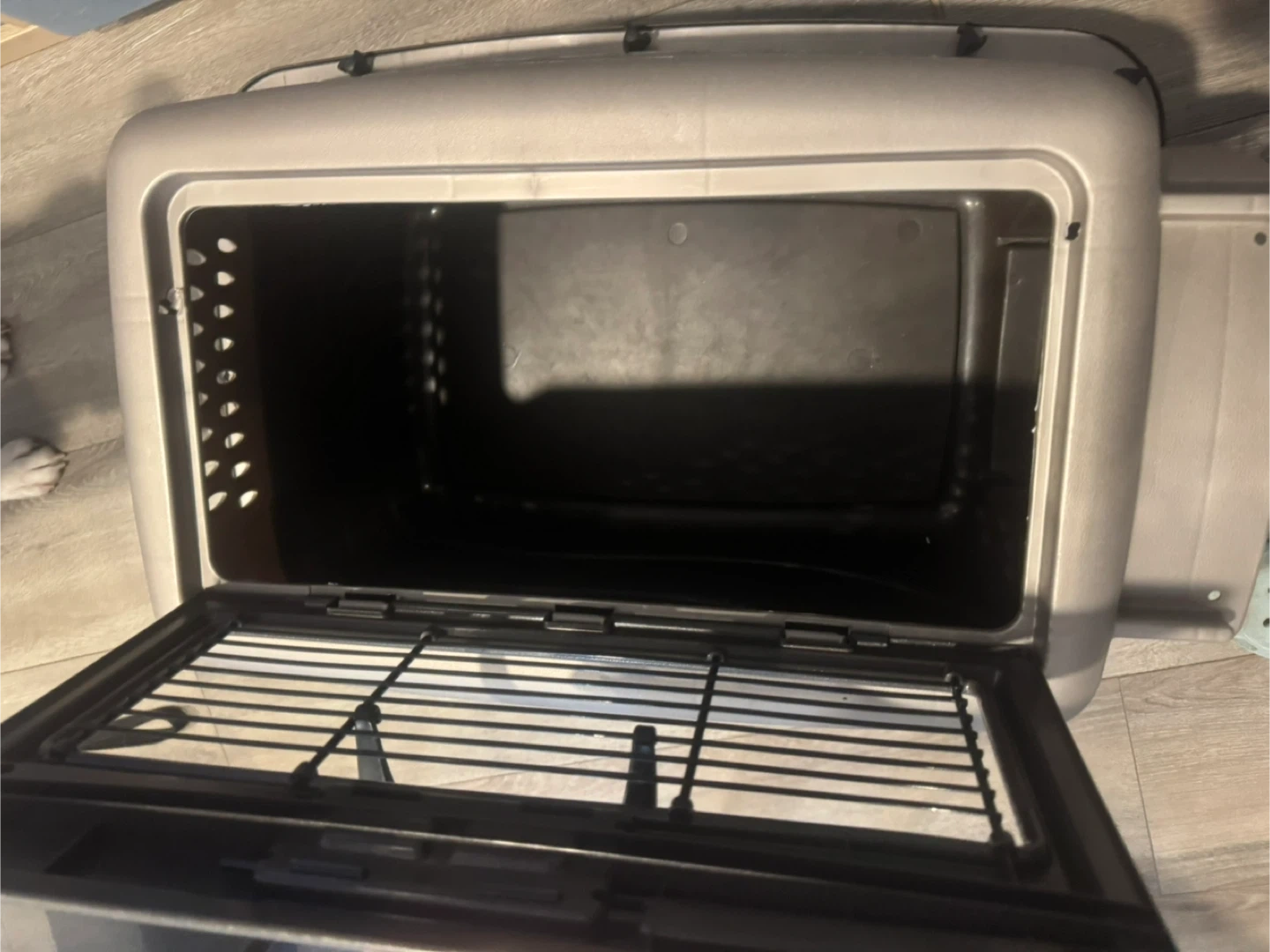 Selling a pet carrier. It is in good condition and ready for your furry friend's next adventure! It has a grey colour and a black grill. It can be opened on top and the front. All locks work fine.