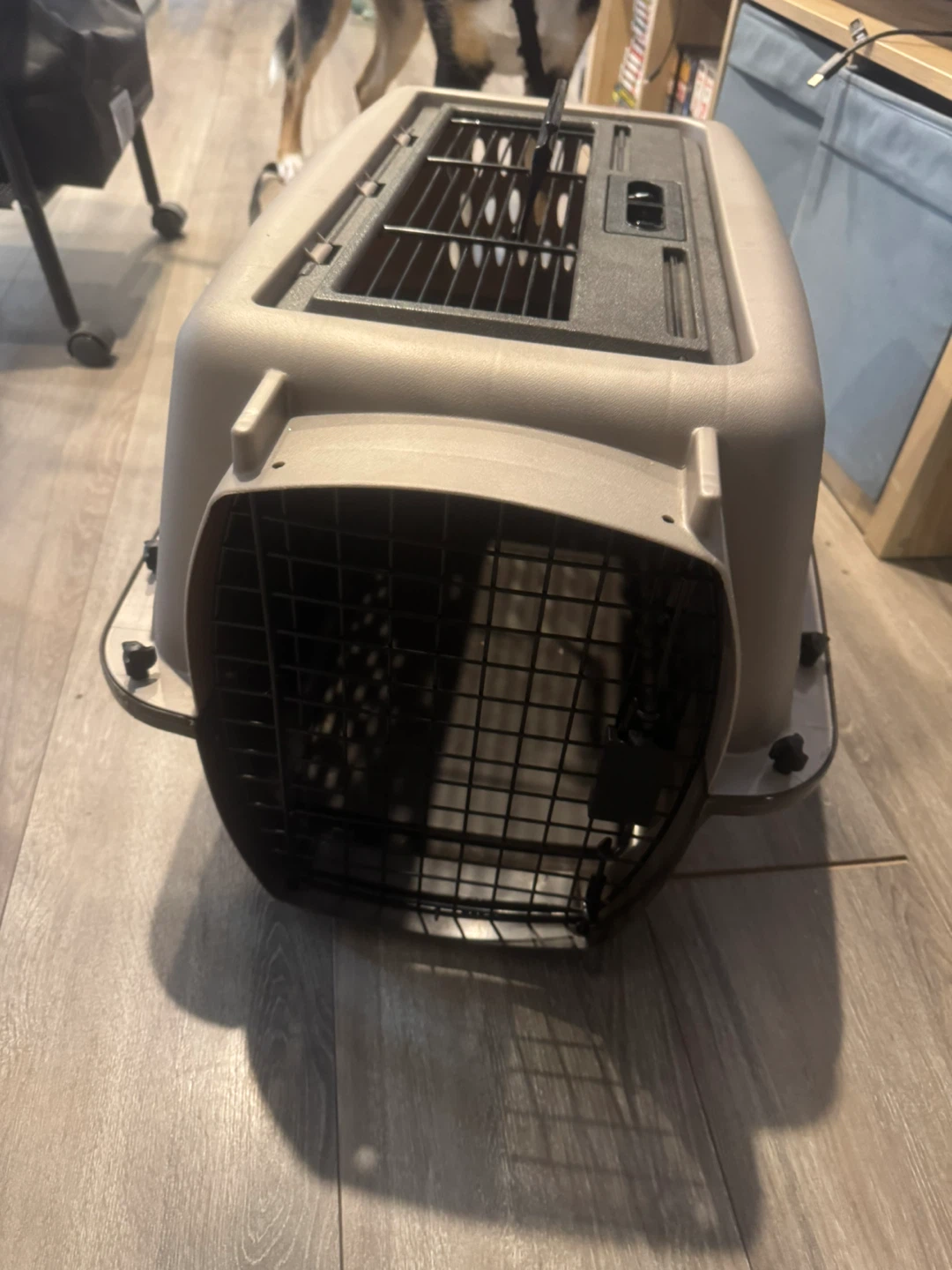 Selling a pet carrier. It is in good condition and ready for your furry friend's next adventure! It has a grey colour and a black grill. It can be opened on top and the front. All locks work fine.