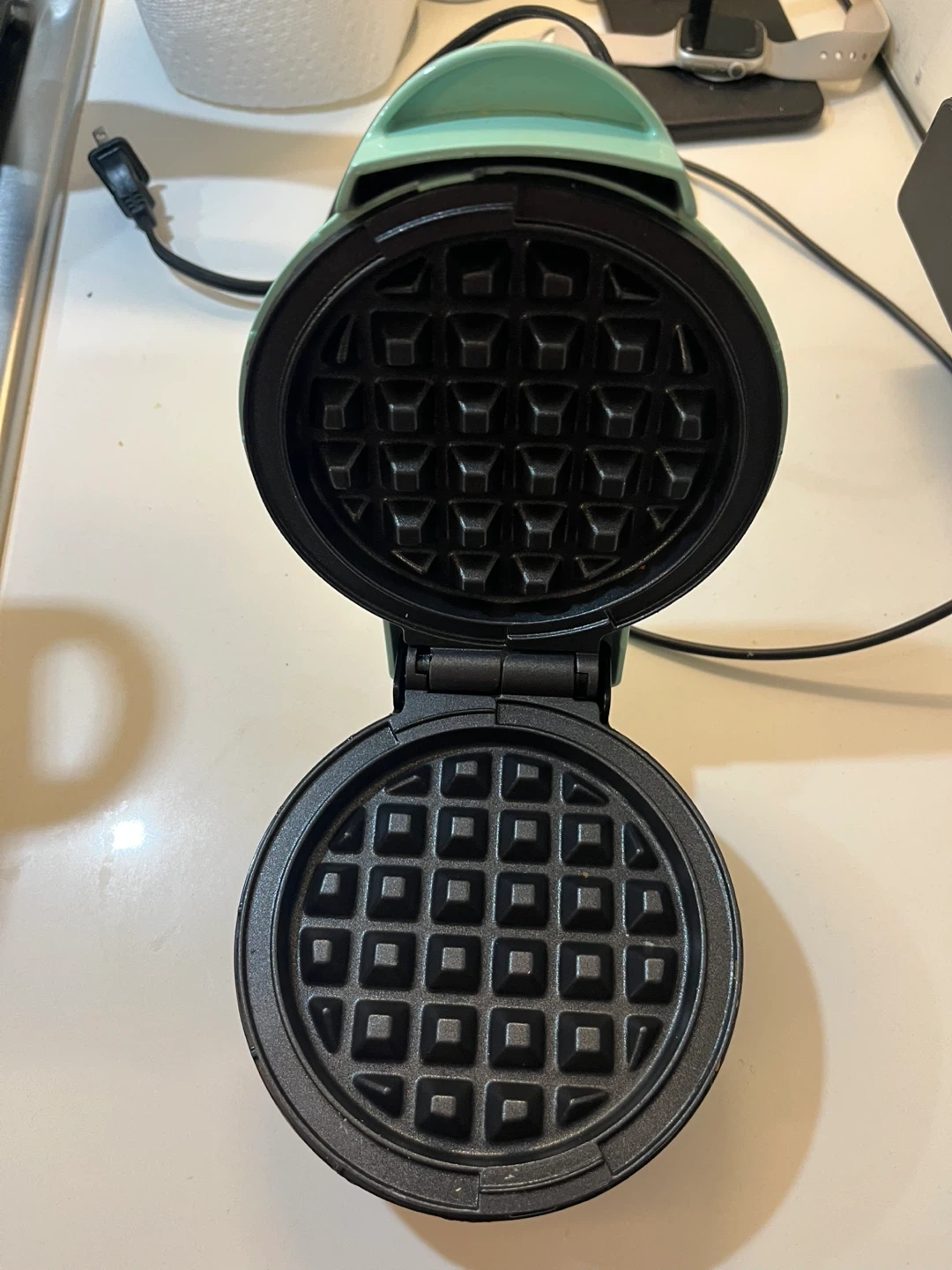 This is a Dash Mini Maker waffle maker with a 4" non-stick cooking surface. It's aqua in color and runs on 350 watts. Perfect for quick breakfasts or snacks!