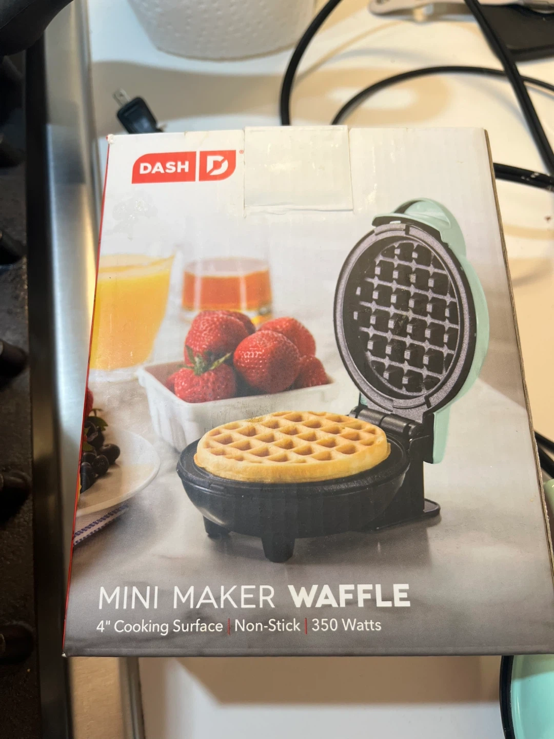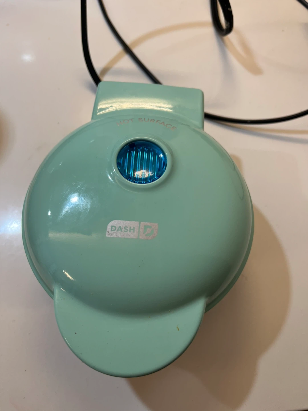 This is a Dash Mini Maker waffle maker with a 4" non-stick cooking surface. It's aqua in color and runs on 350 watts. Perfect for quick breakfasts or snacks!
