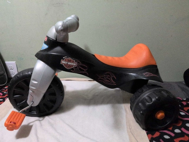Selling a Fisher-Price Harley-Davidson Lights and Sounds Tricycle. This used tricycle features sturdy construction and a cool Harley-Davidson design with lights and sounds. It's in good used condition with some normal wear and tear. Sure to bring a smile to your little one's face! Priced at $25. If the ad is still up, it's still available!